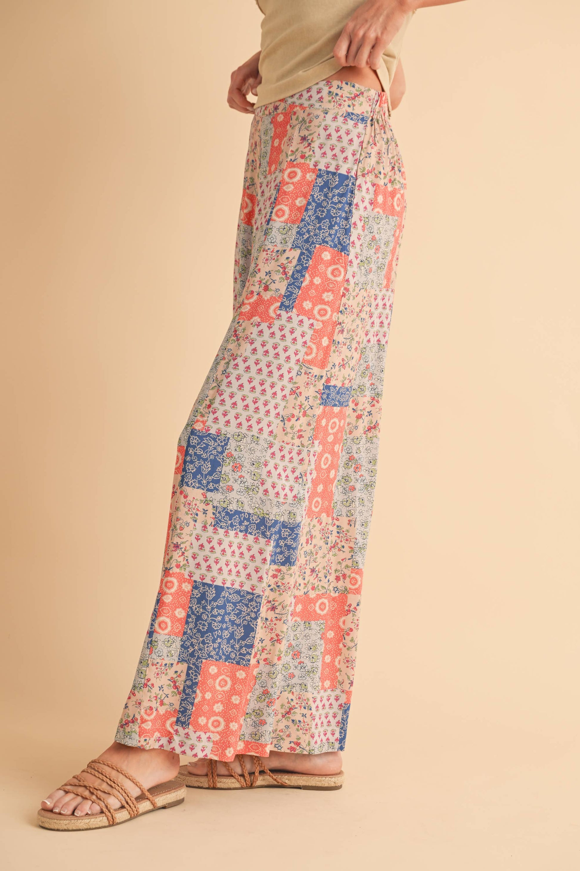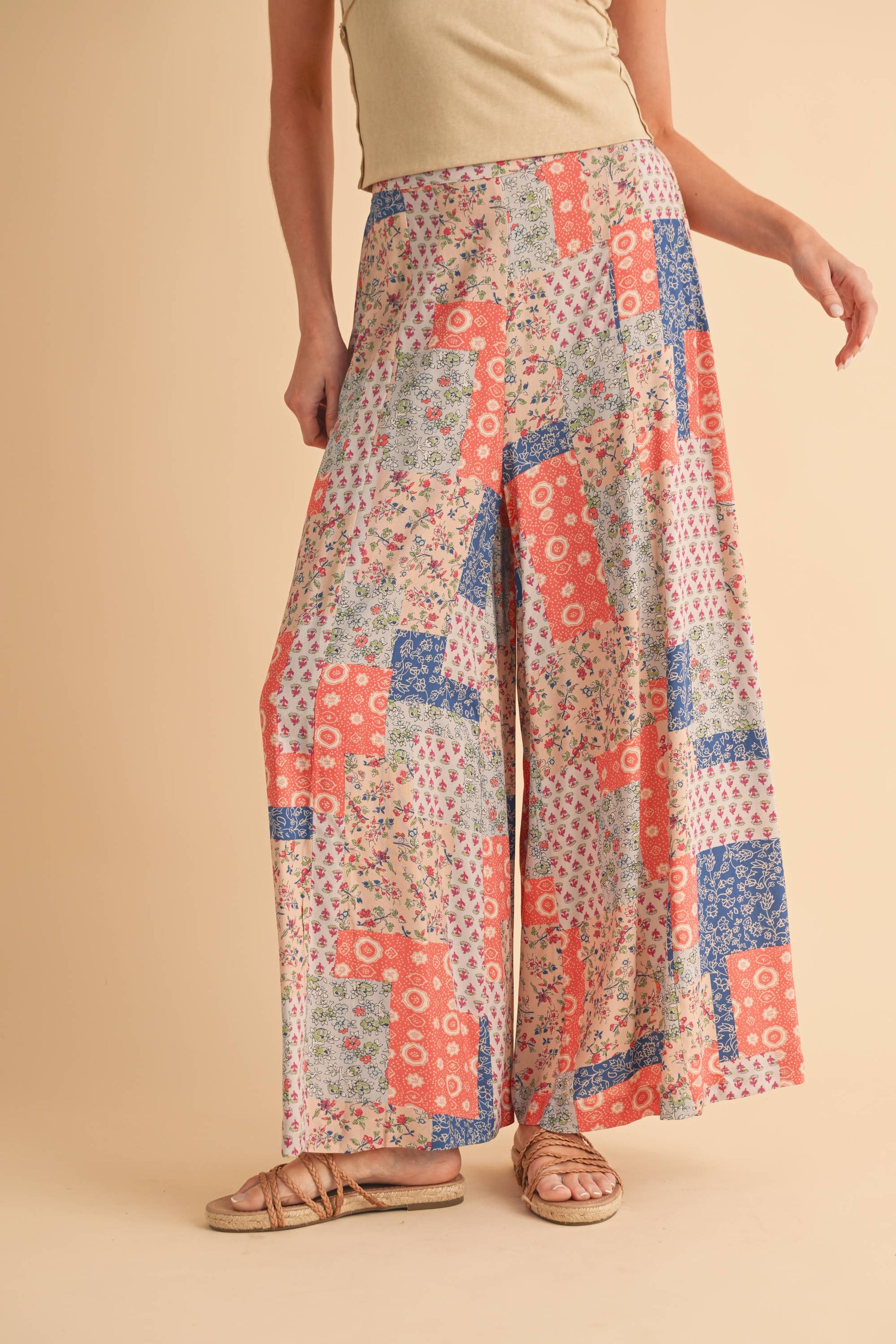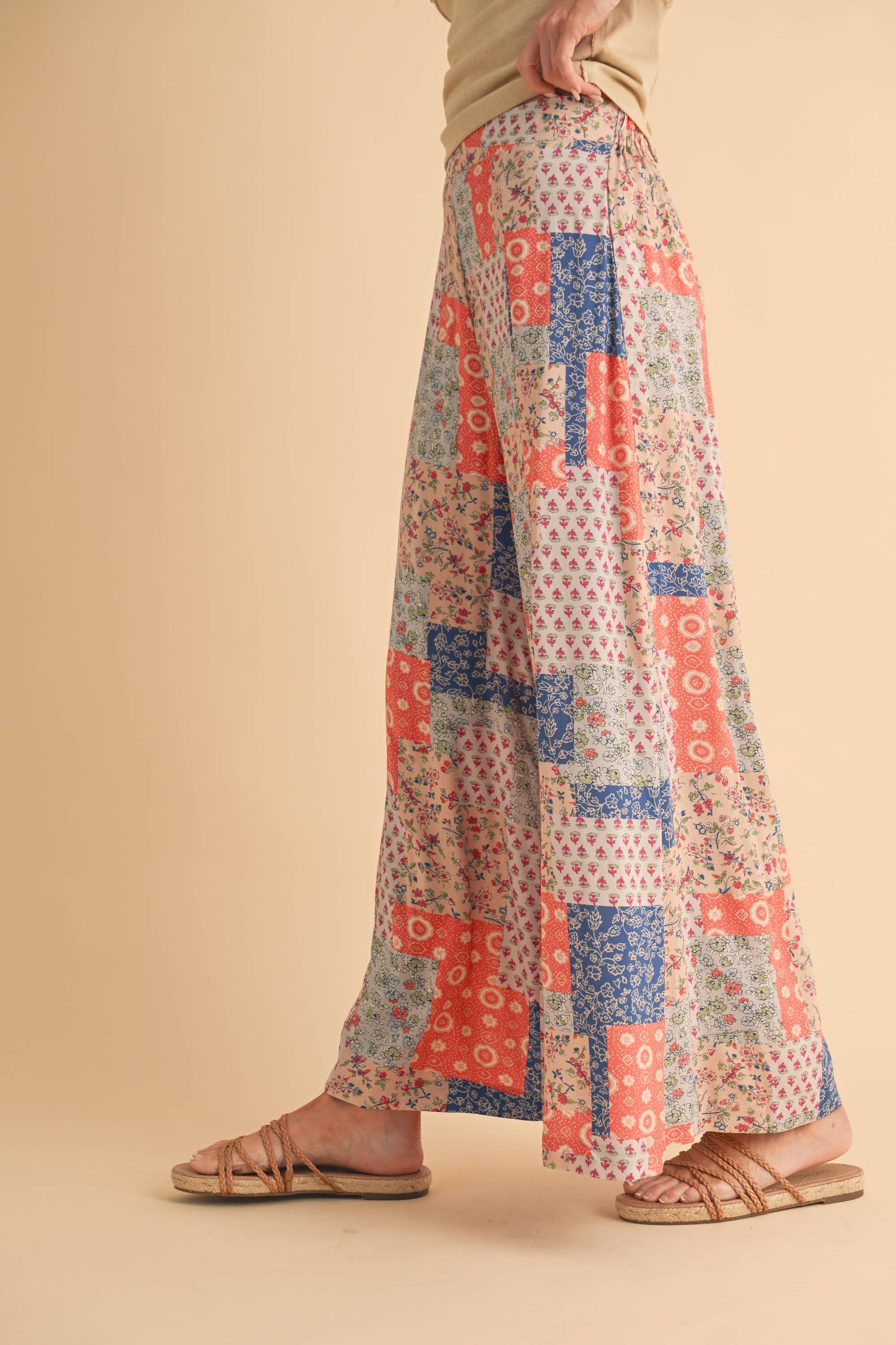 Coline printed pants showcases a relaxed patchwork skirt in earthy tones of red, green, and beige, with floral and geometric patterns, complemented by simple sandals for a laid-back, boho-chic vibe.