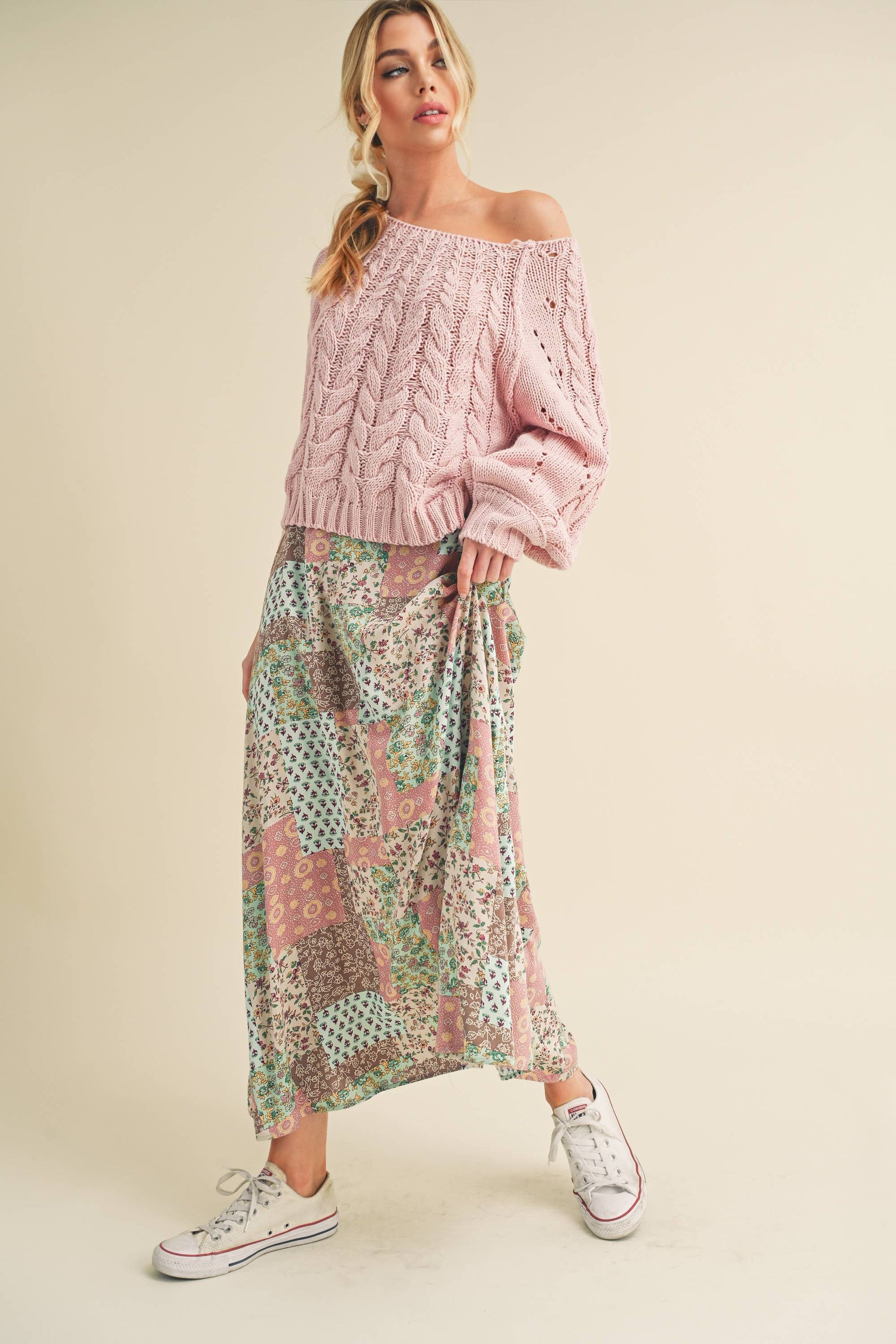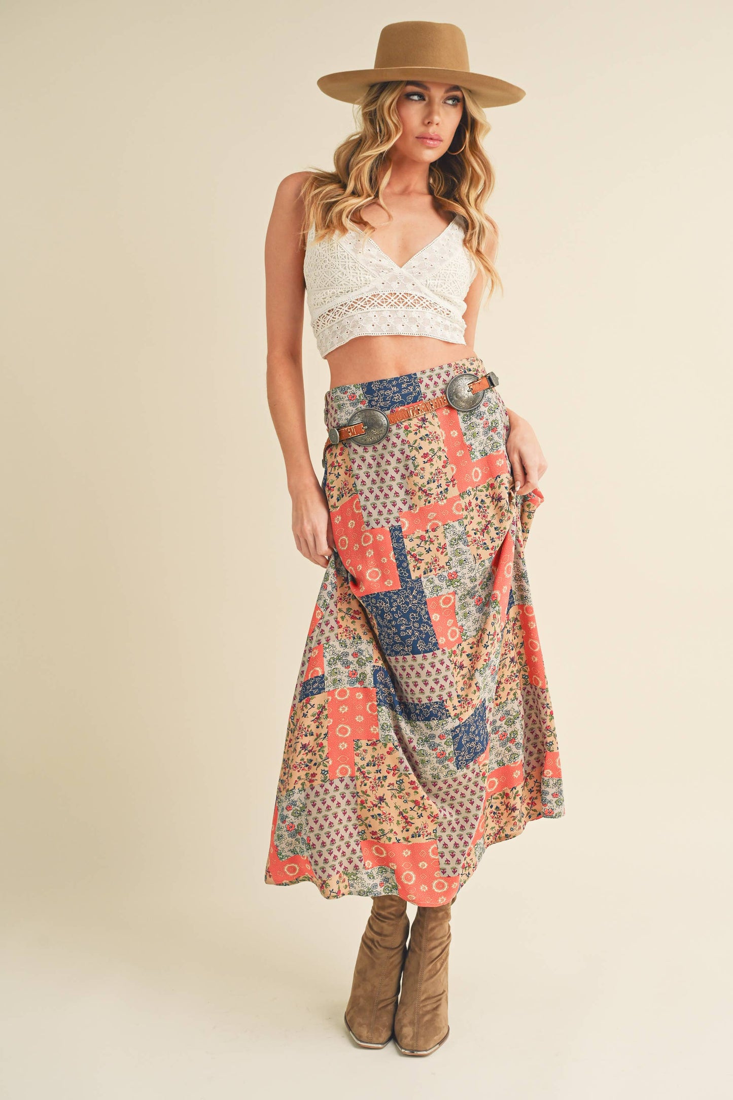 Sway with bohemian grace in this flowy maxi skirt. The elasticized back ensures a comfortable fit, while the patchwork print adds a free-spirited touch, making it the perfect choice for festival vibes. Embrace effortless style and movement in this whimsical addition to your wardrobe.
