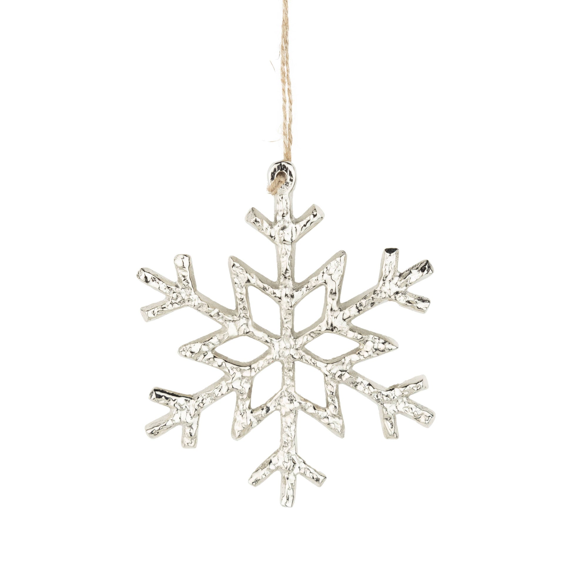Cast metal snowflake ornament, silver, 5 in. Please note that due to the nature of the materials,slight color variations may occur between individual items and compared to images. These differences are minimal and do not affect the overall appearance.