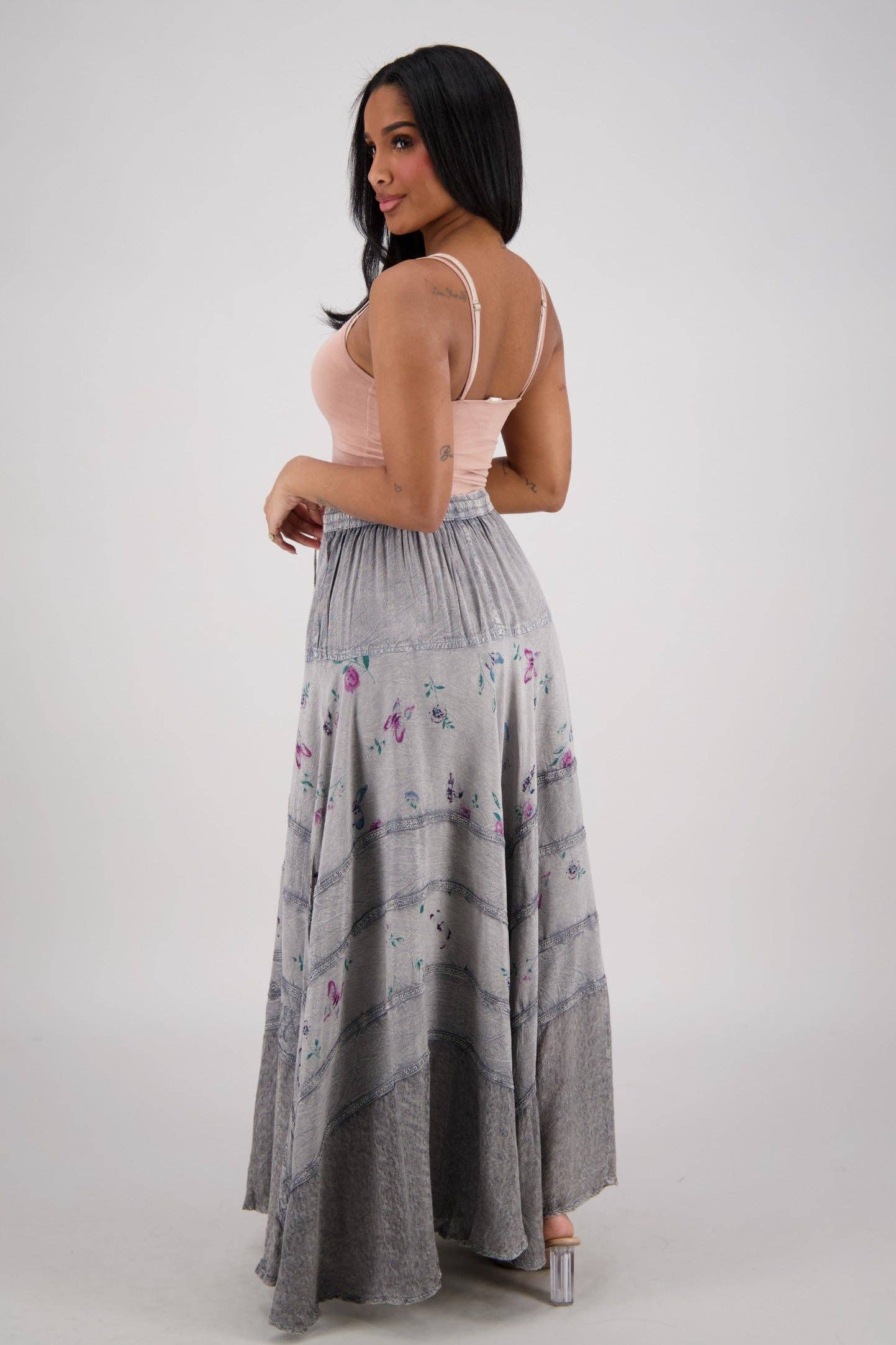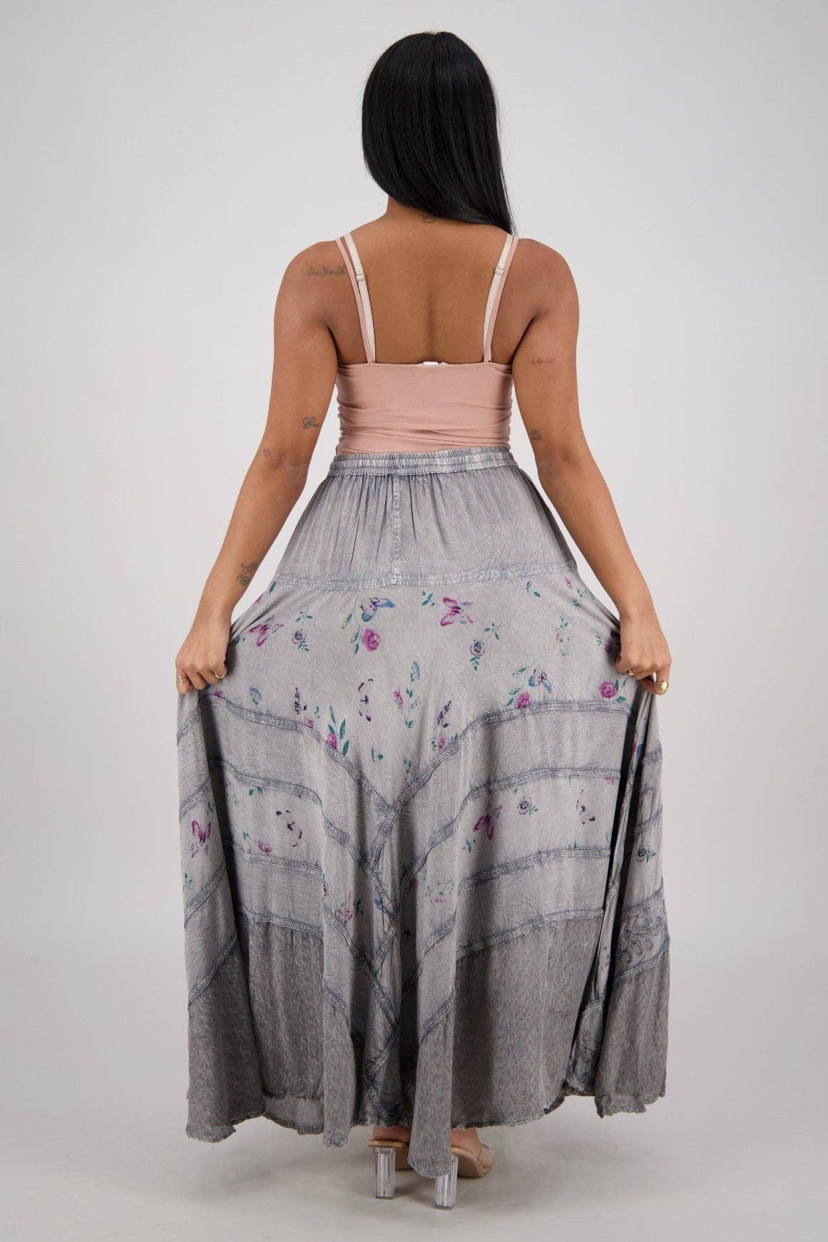 Acid wash skirt with printed floral panels.