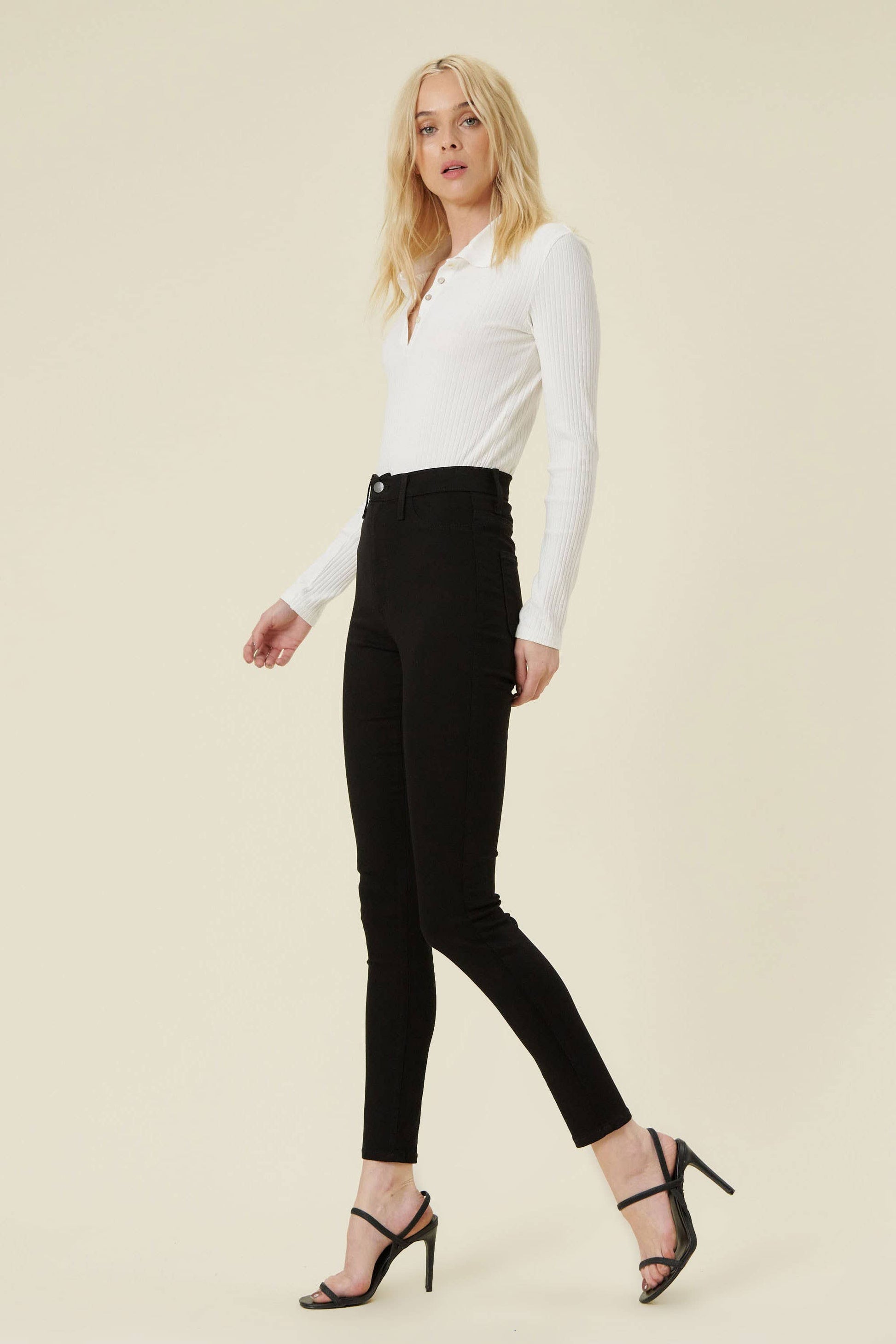 A pair of high waisted skinny jeans featuring faux front pockets, two back patch pockets, and a zip-fly closure.