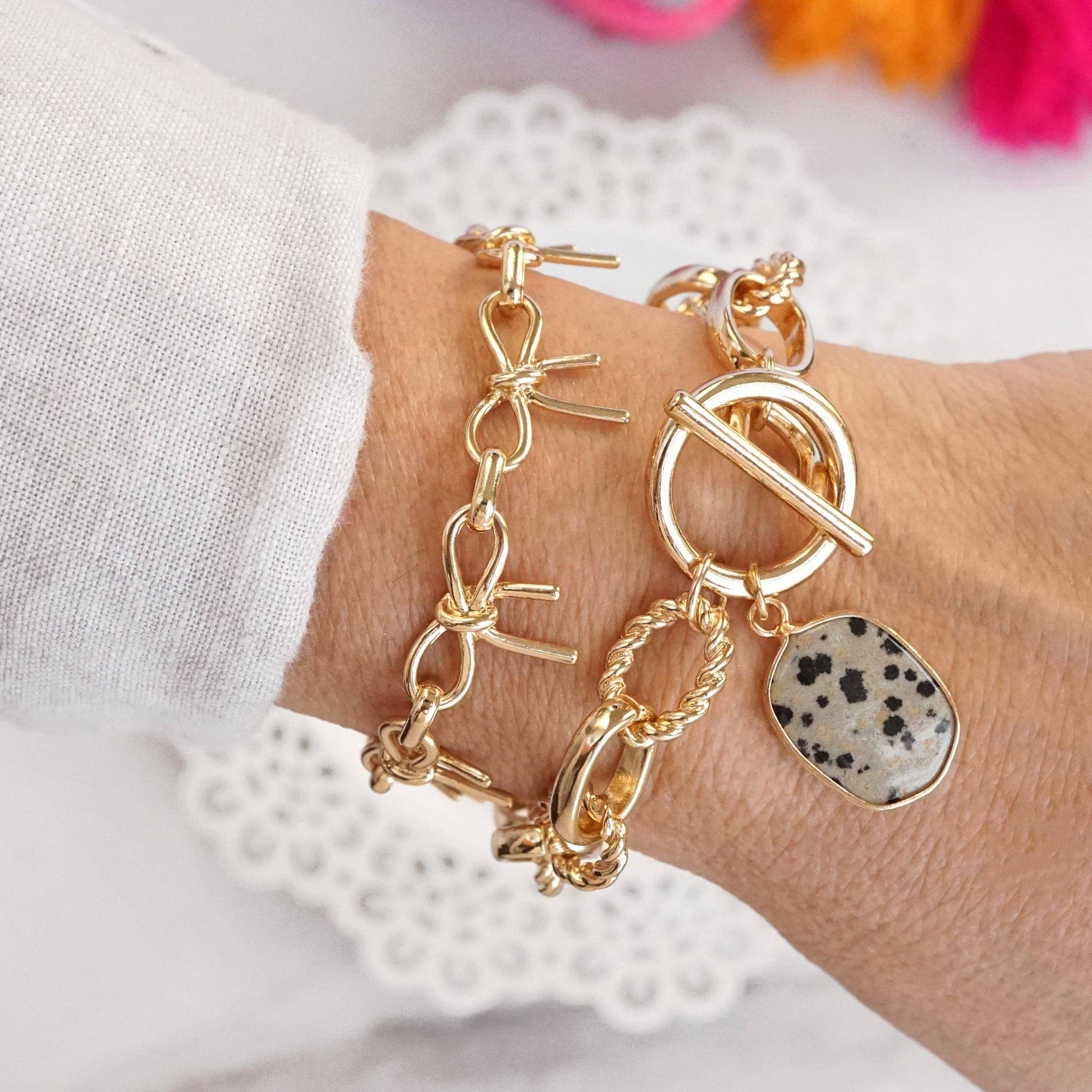 A stunning and trendy addition to your jewelry collection. Crafted from durable alloy in a beautiful gold tone, this eye-catching bracelet features a links design with toggle closure with to rings that ensures a comfortable fit.