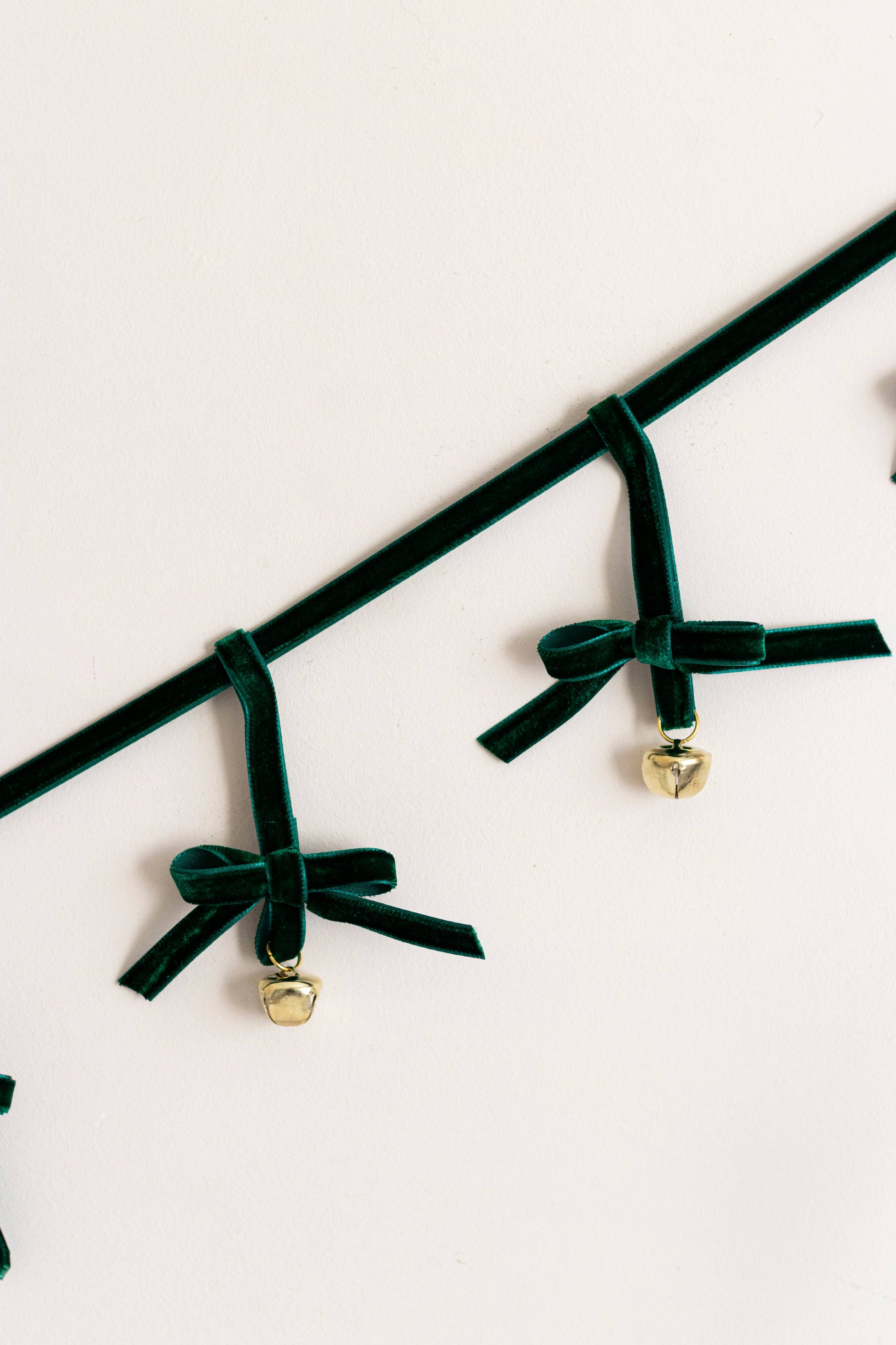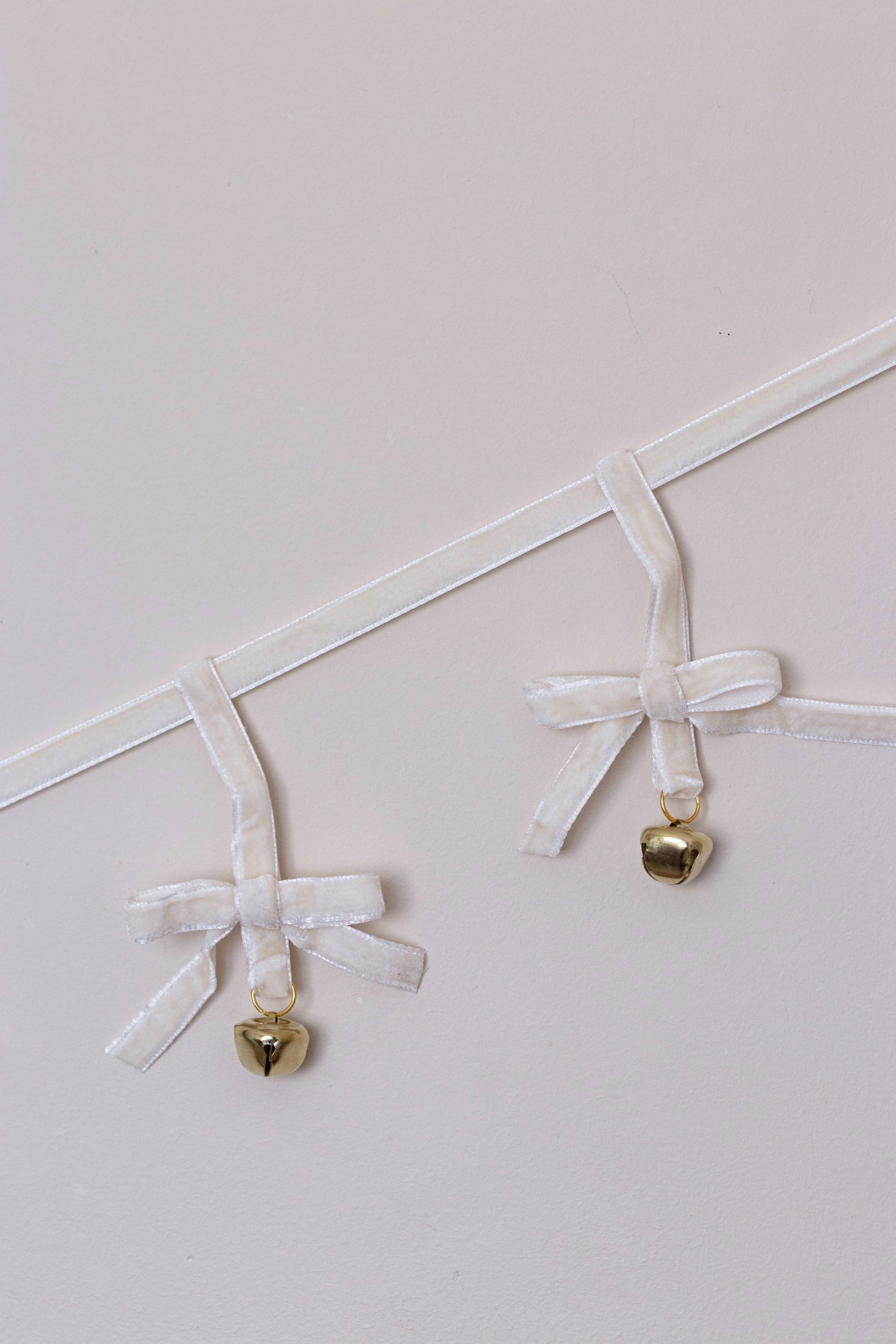 Decorate your tree, staircase, or fireplace in traditional Christmas style with the "Velvet Bell Ribbon Chain" from the Beige & Stone Christmas collection. Each with ten red bows and gold bells.