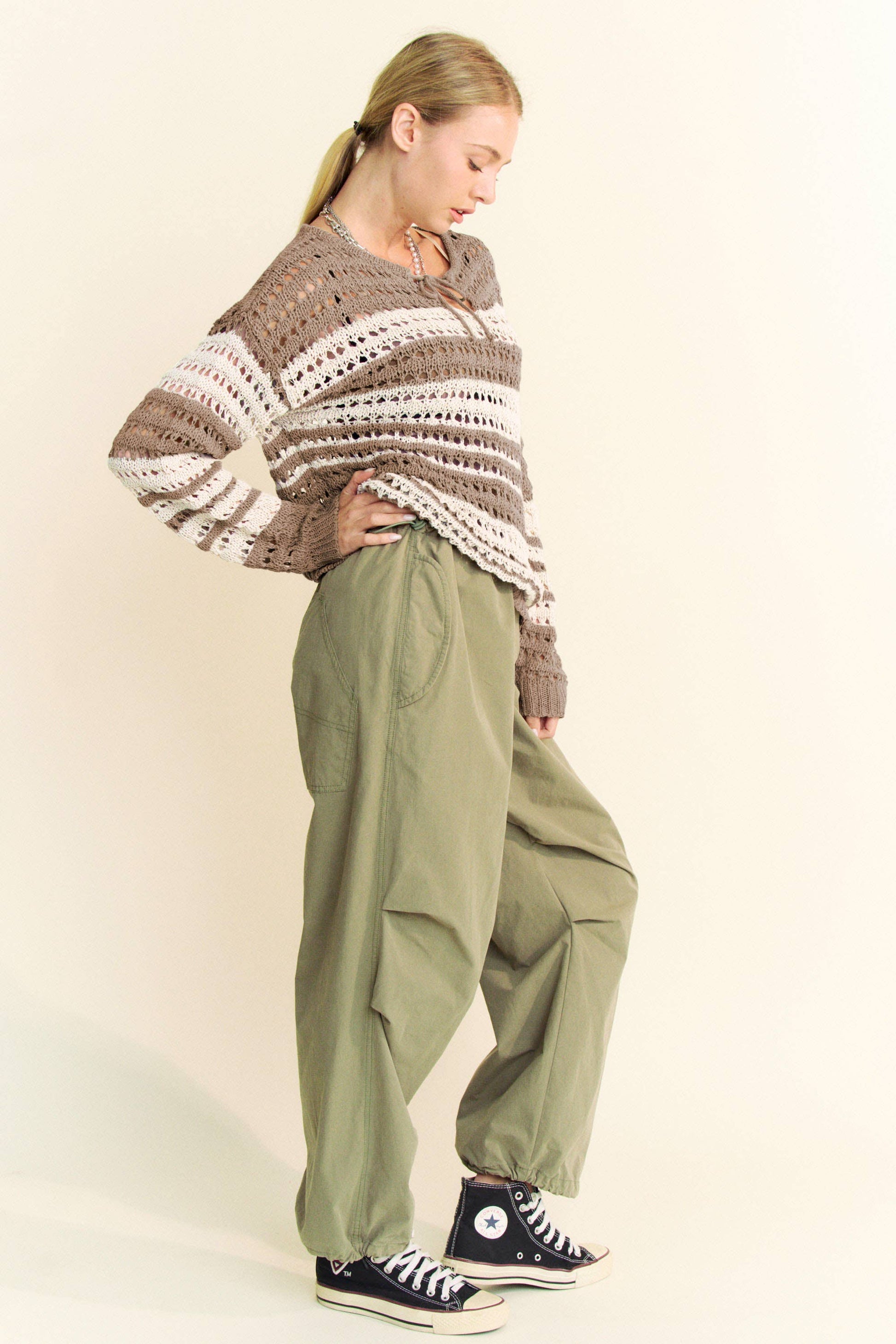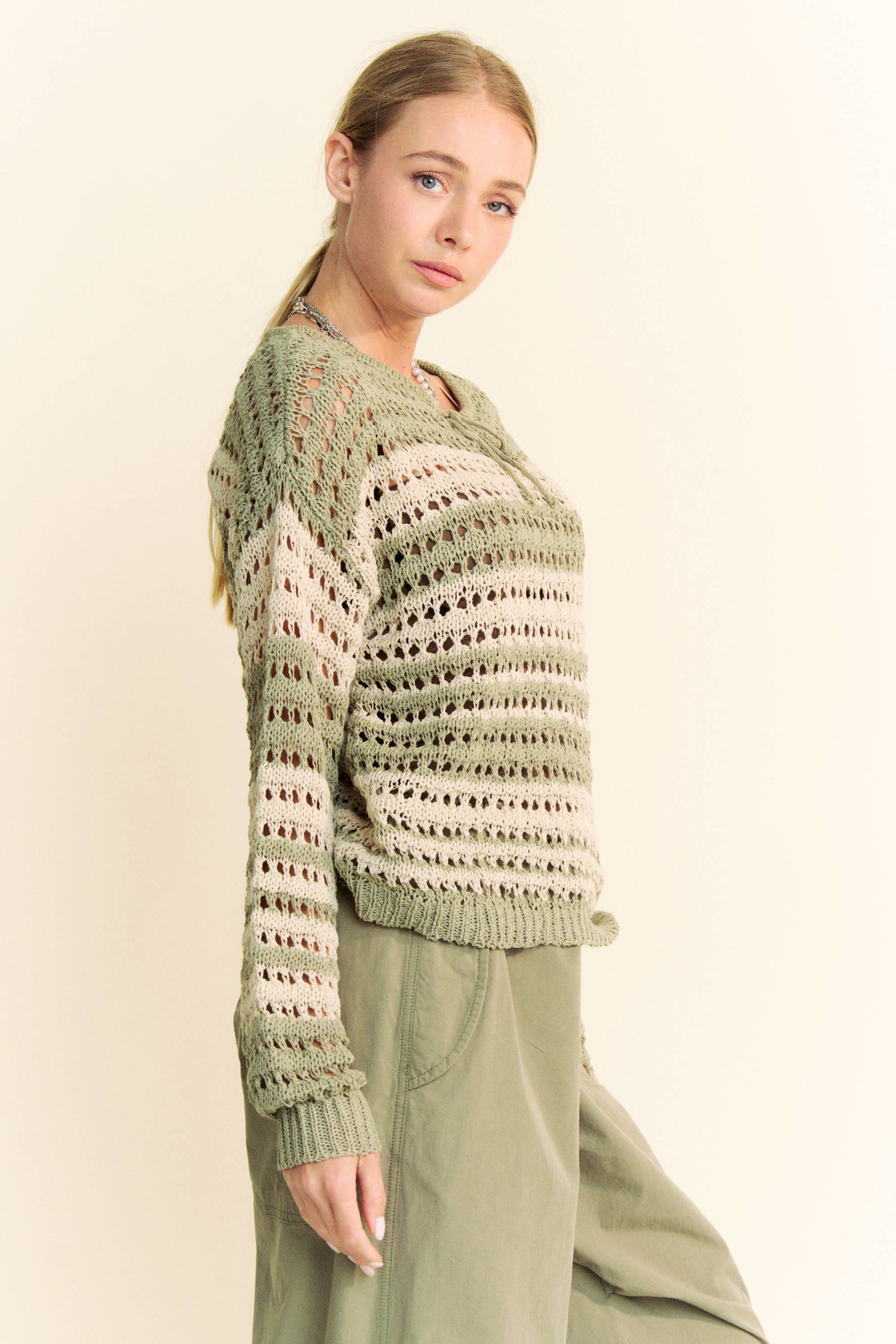 CHROCHET LONG SLEEVE ROUND NECK TIE RIBBON DETAIL DROPPED SHOULDER LOOSE FIT KNIT SWEATER COVER UP TOP
