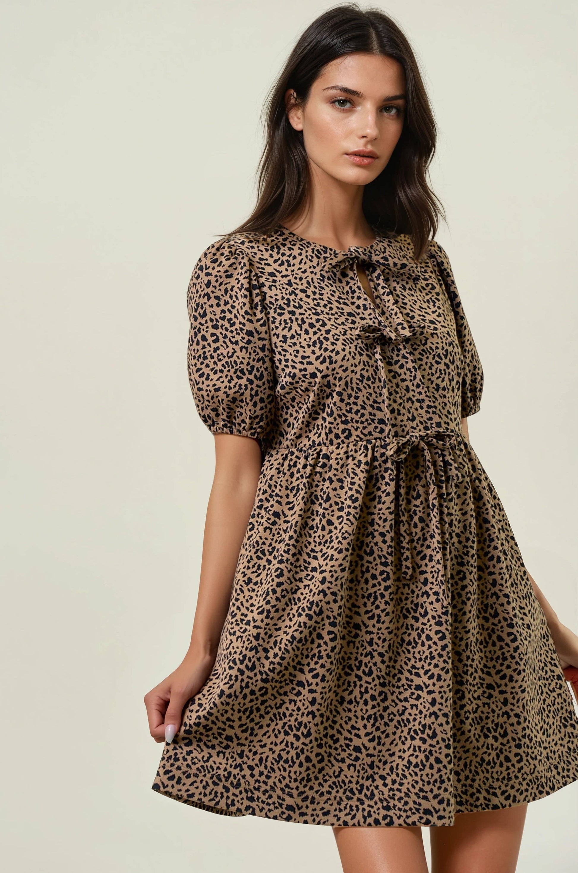 COTTON ANIMAL PUFF SHORT SLEEVE BOW TIE FRONT DRESS