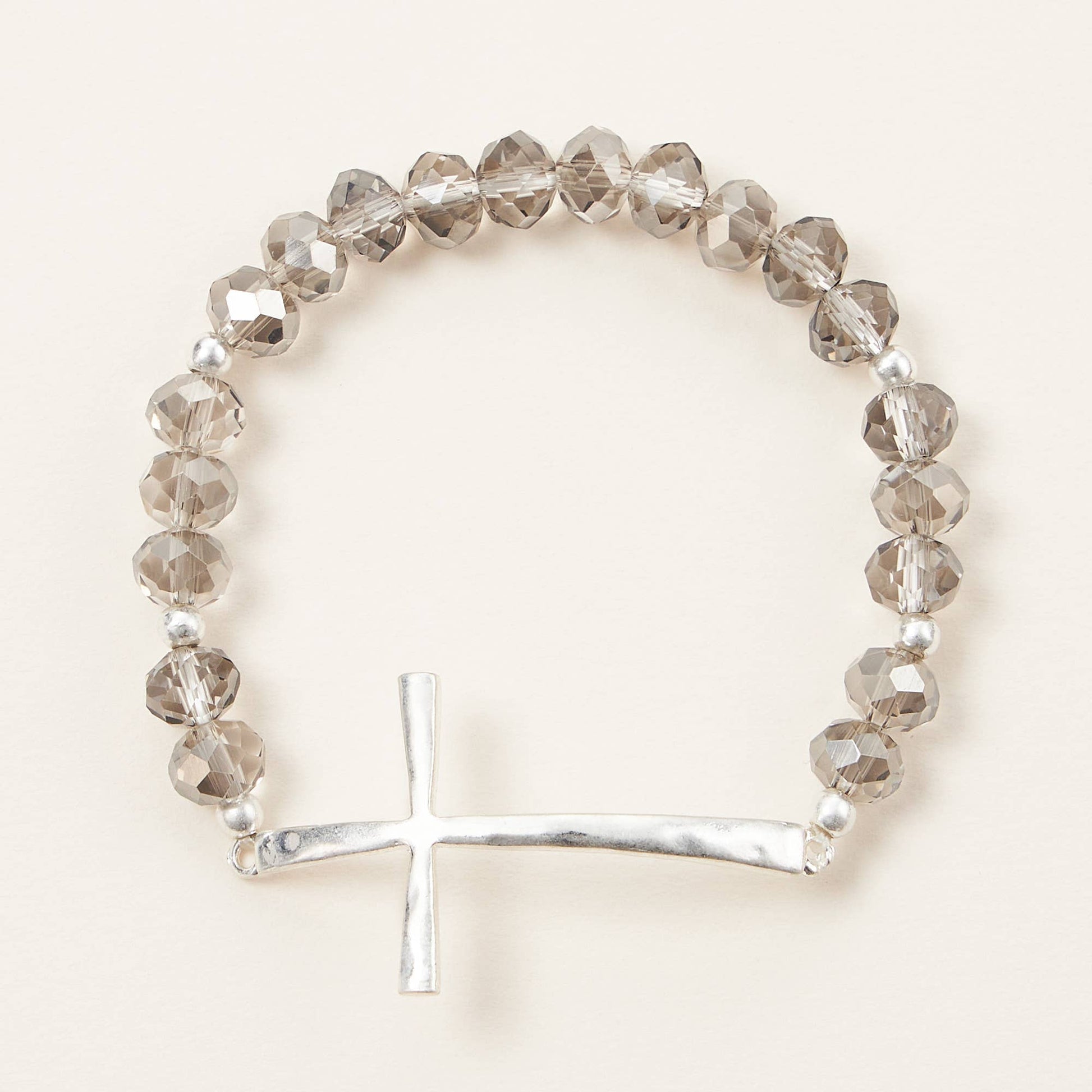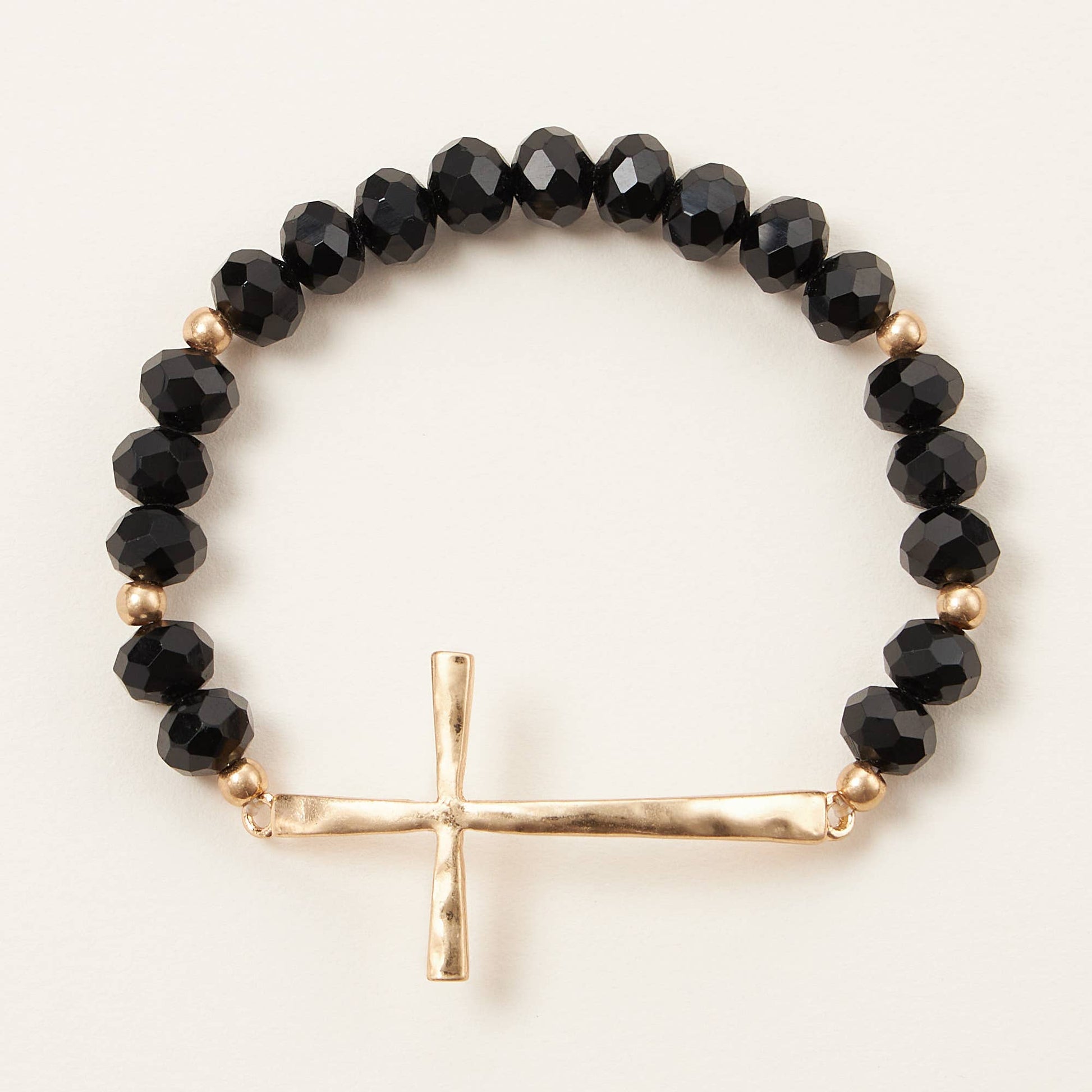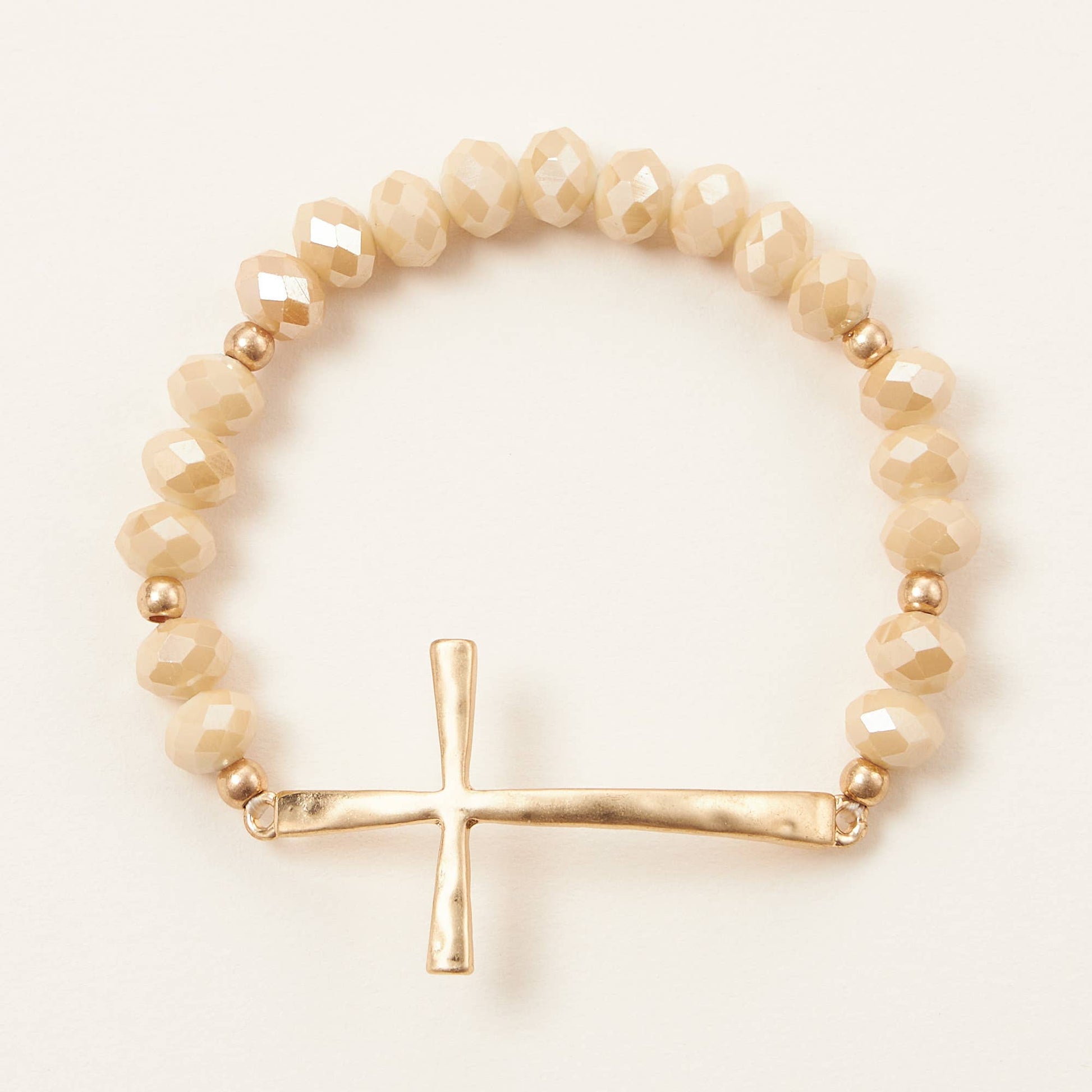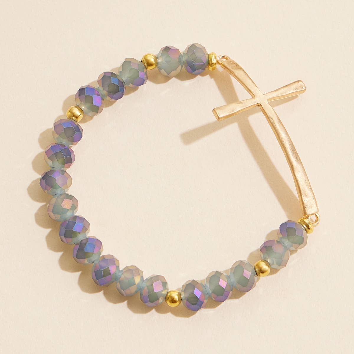 This Glass and Metal Beaded Stretch Bracelet with hammered metal cross shaped charm adds a touch of elegance to any outfit. With its stretch design, it offers a comfortable fit for all wrist sizes. Perfect for everyday wear or special occasions.