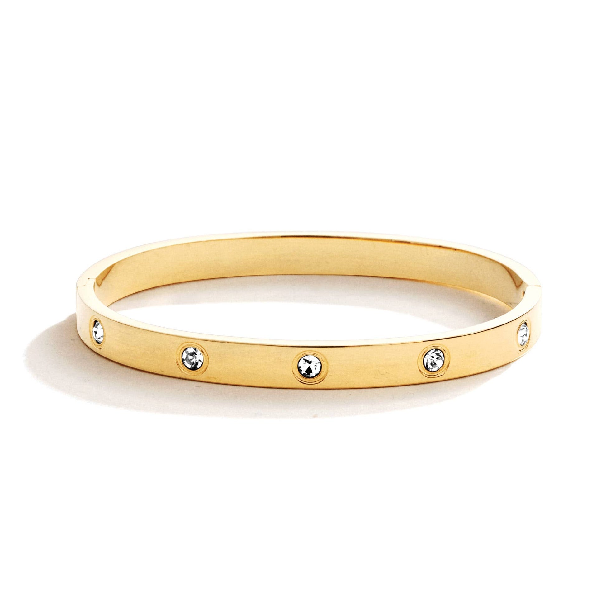 Check out this stunning Cubic Zirconia Hinged Stainless Steel Bangle for a luxurious gleam and a timeless look. Adorn yourself in elegance with this exquisite piece!