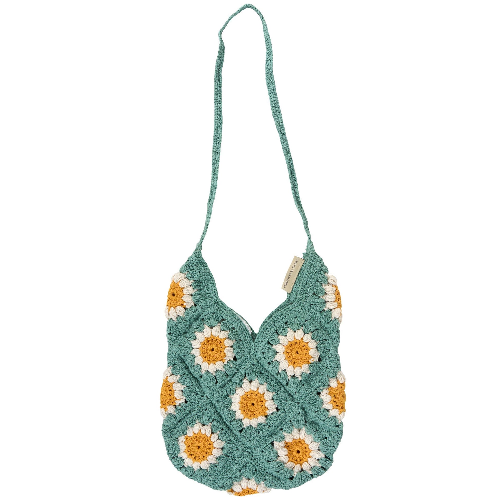 A cotton tote bag from our Cottagecore Collection displaying daisy inspired crocheted designs on the bag. Our Daisies tote is 11 inch by 13 inch and fully-lined, ideal for storing everyday items when on the go. Spot clean only. A stylish daisy-themed accessory perfect for shopping and daily activities.