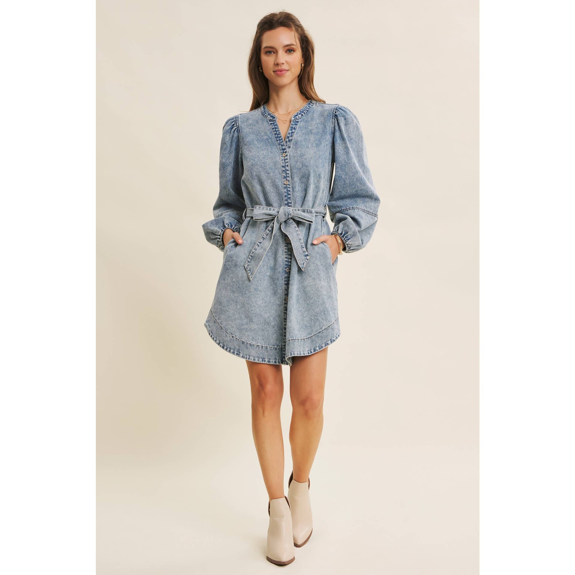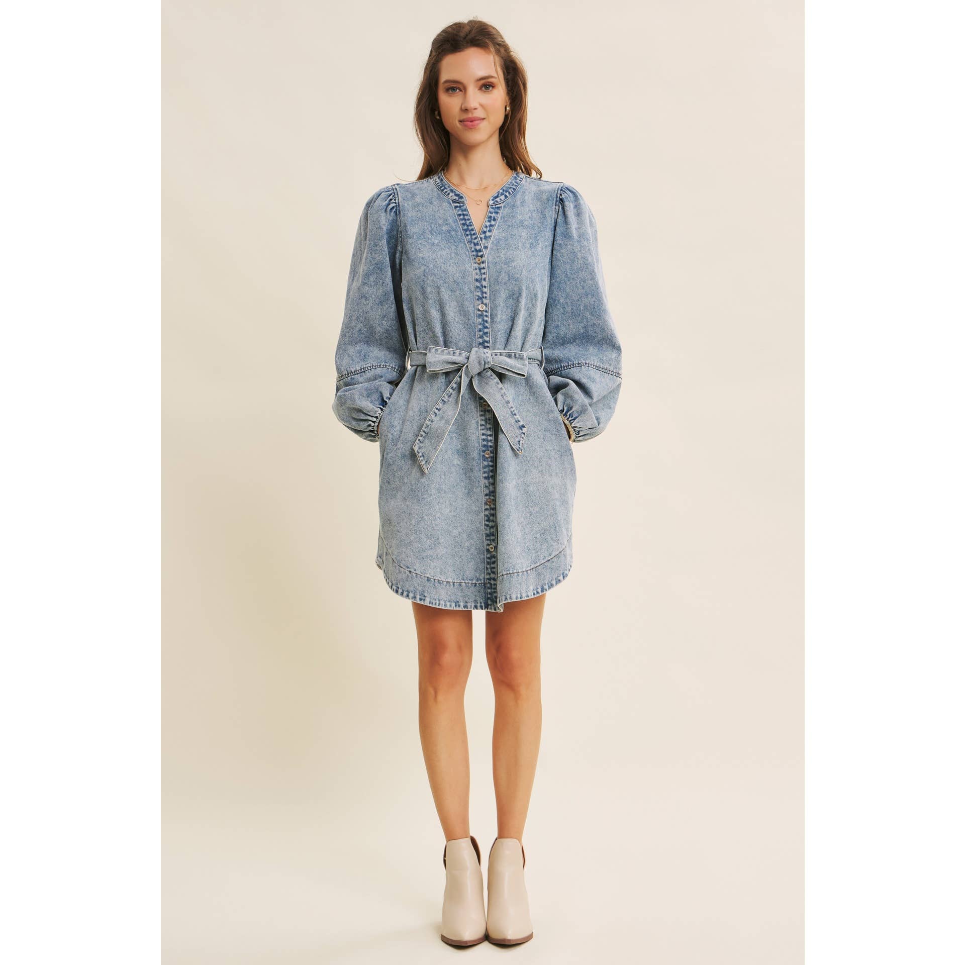 Crafted in our signature washed denim, this A-line mini dress stands out with its rich, lived-in tone and refined texture. The flattering rounded hem and soft balloon sleeves add movement, while the waist belt cinches just right for a romantic silhouette.