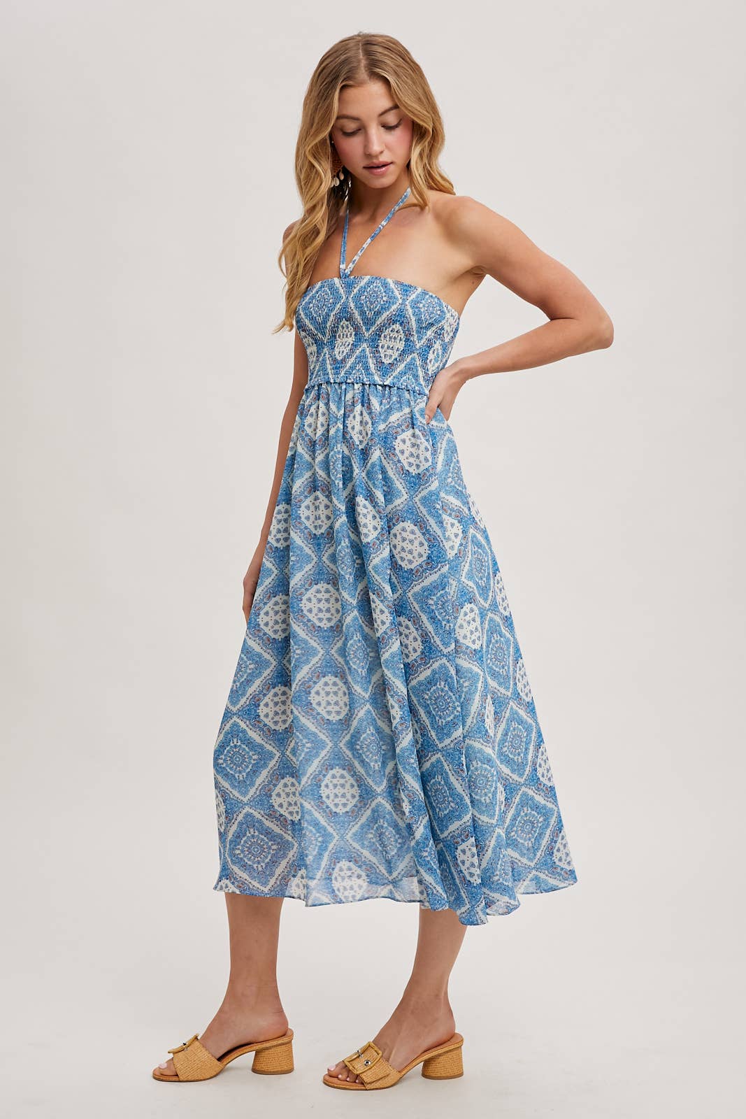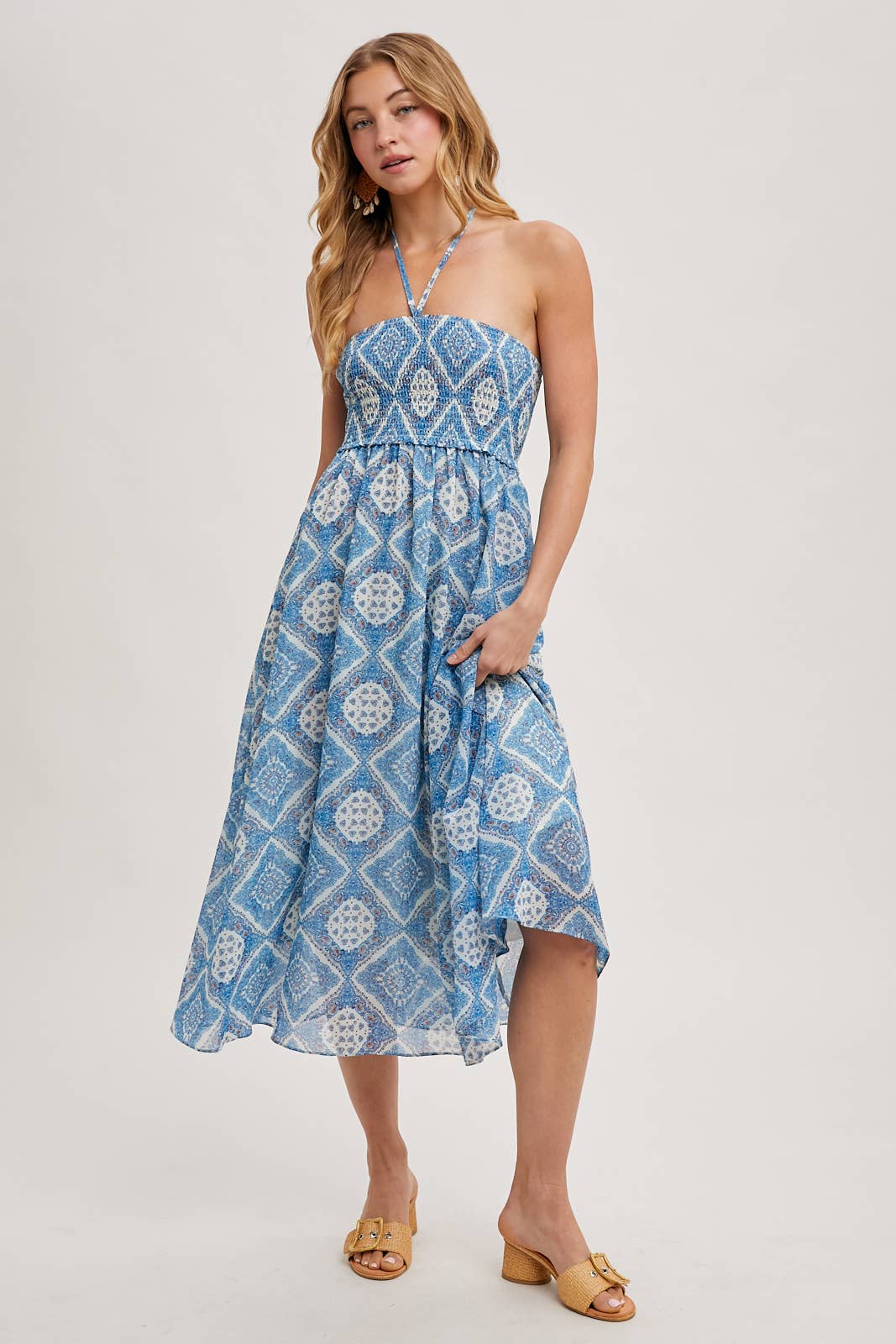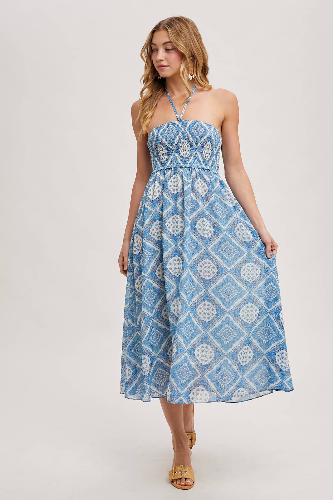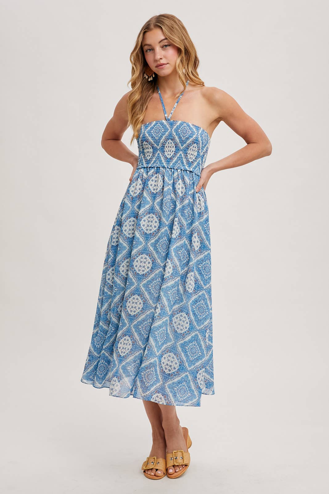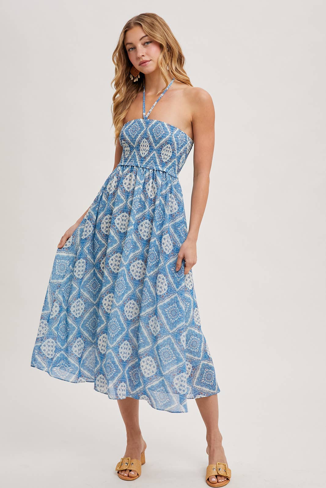 The geo print smocked halter dress combines a bold pattern with a flattering silhouette for a chic and effortless look. Featuring a smocked bodice for a comfortable, fitted feel, this dress is complemented by a halter neckline that adds a touch of elegance. The flowing skirt ensures ease of movement, making it perfect for casual outings, beach days, or summer events. Its eye-catching geometric print adds a modern flair, making it a stylish choice for warm-weather dressing.