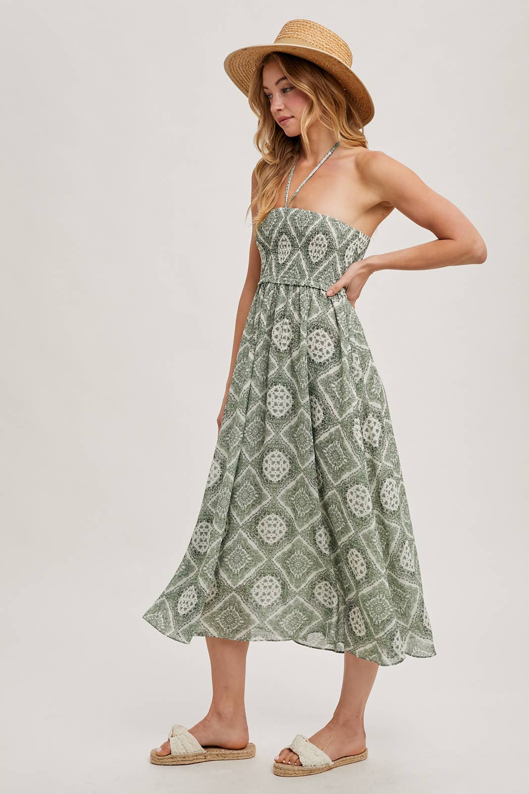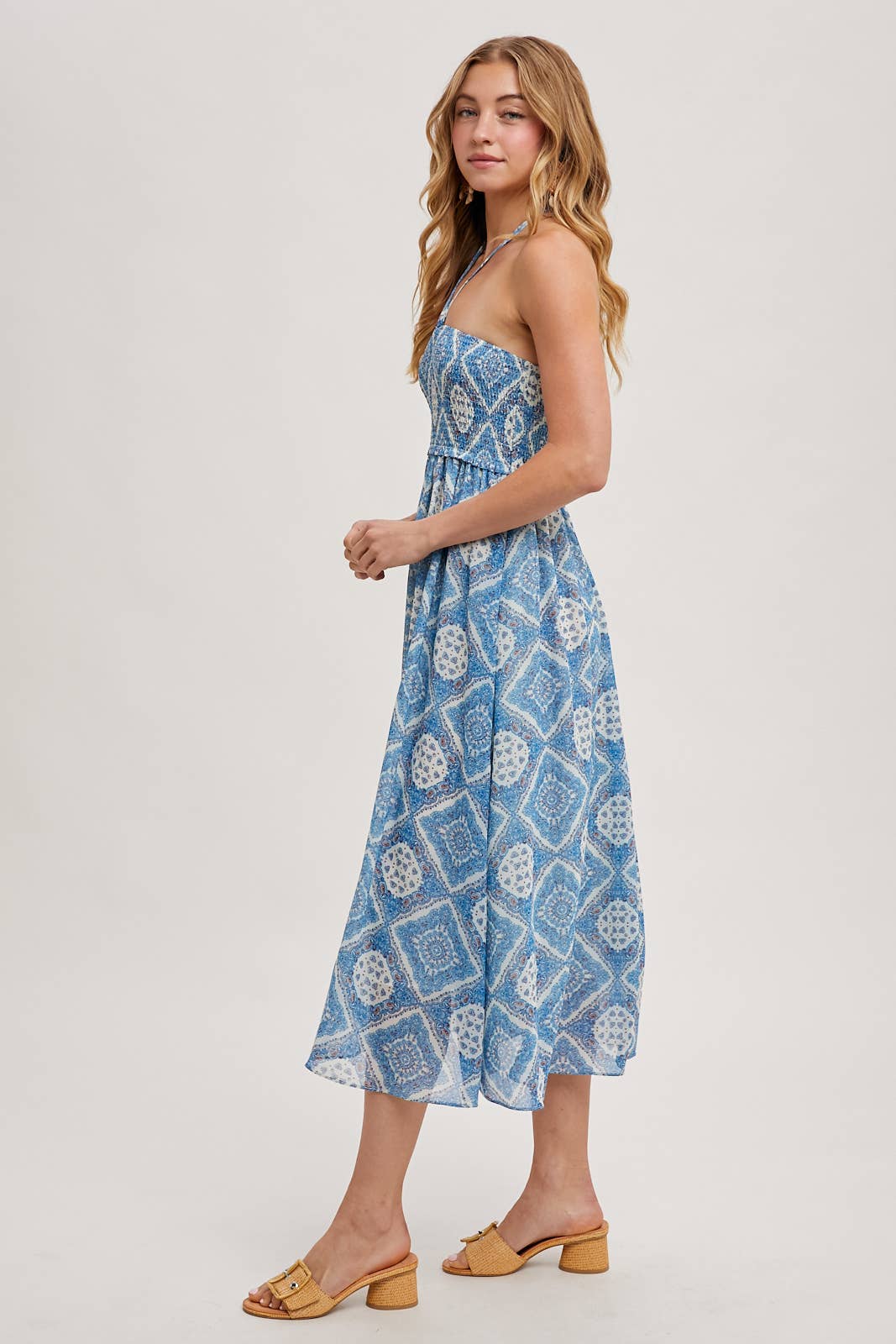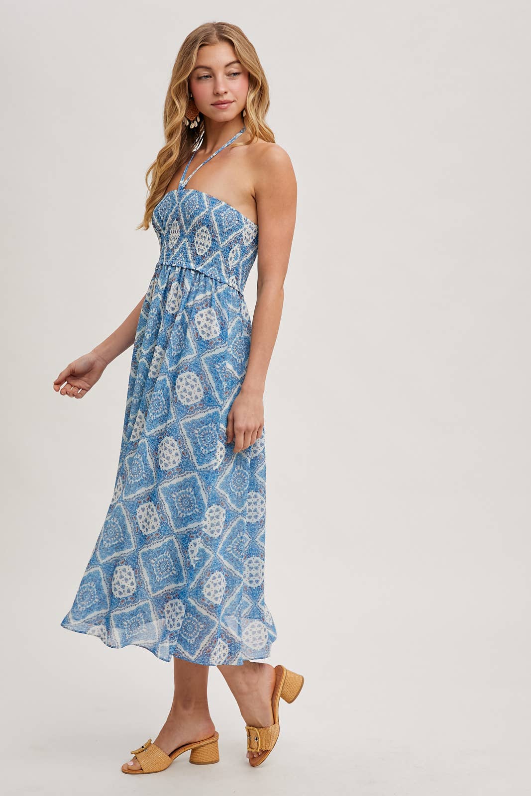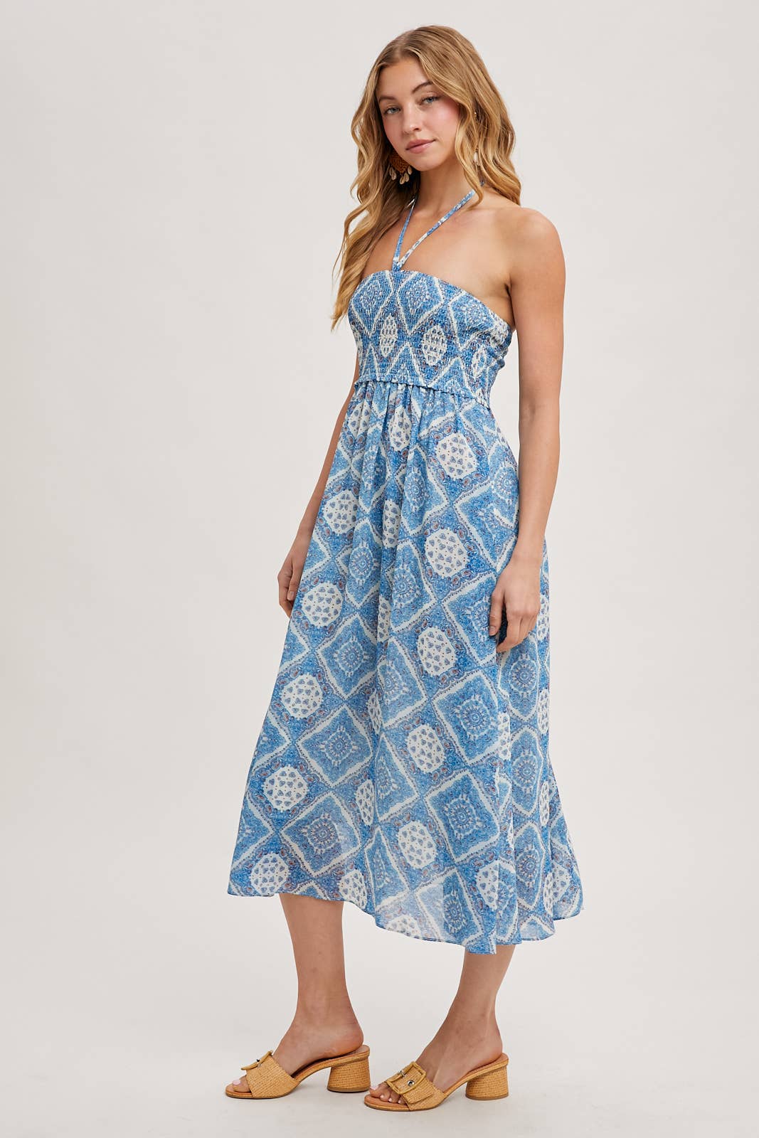 The geo print smocked halter dress combines a bold pattern with a flattering silhouette for a chic and effortless look. Featuring a smocked bodice for a comfortable, fitted feel, this dress is complemented by a halter neckline that adds a touch of elegance. The flowing skirt ensures ease of movement, making it perfect for casual outings, beach days, or summer events. Its eye-catching geometric print adds a modern flair, making it a stylish choice for warm-weather dressing.