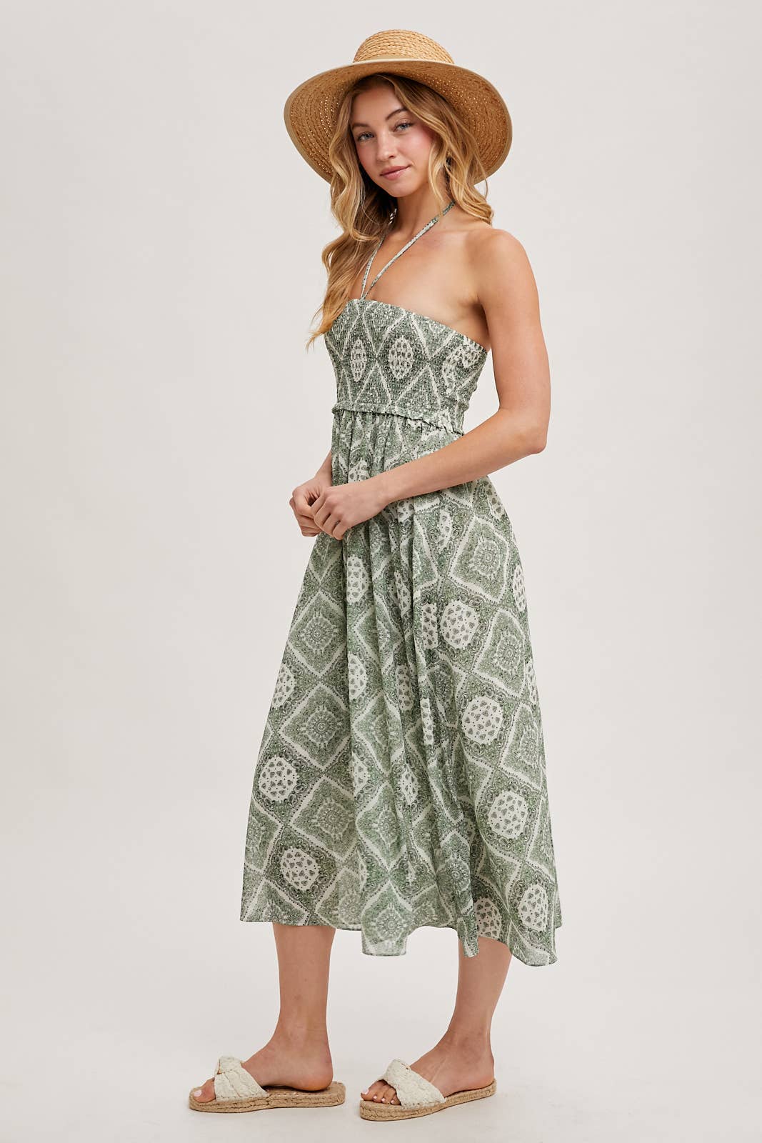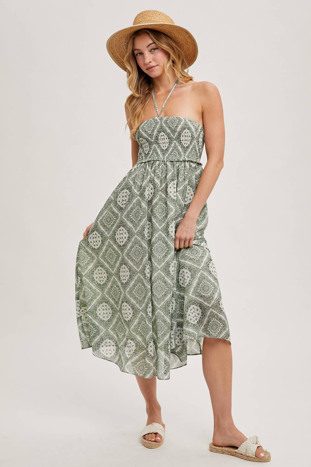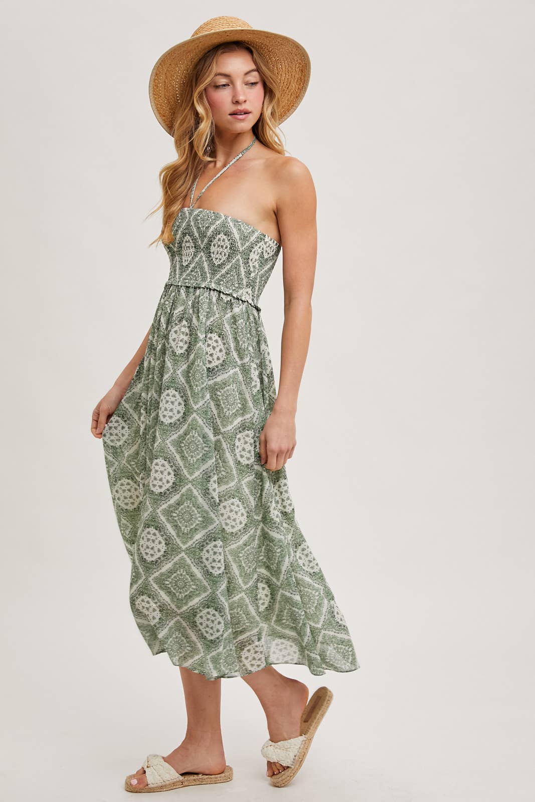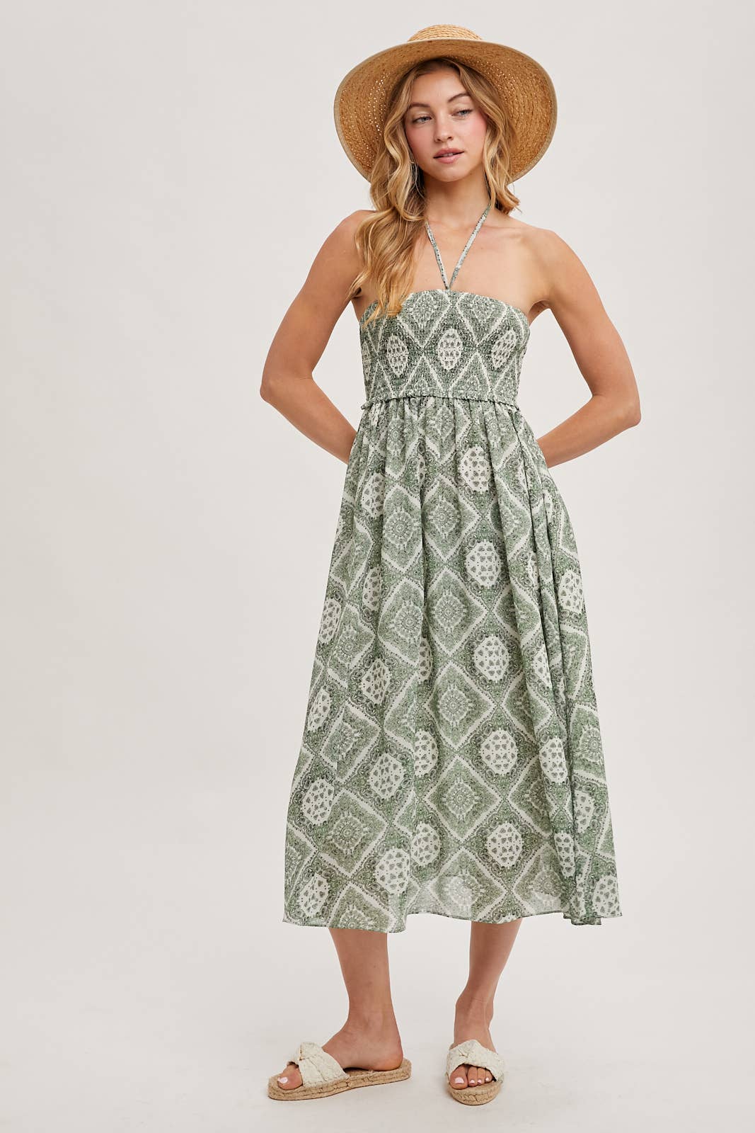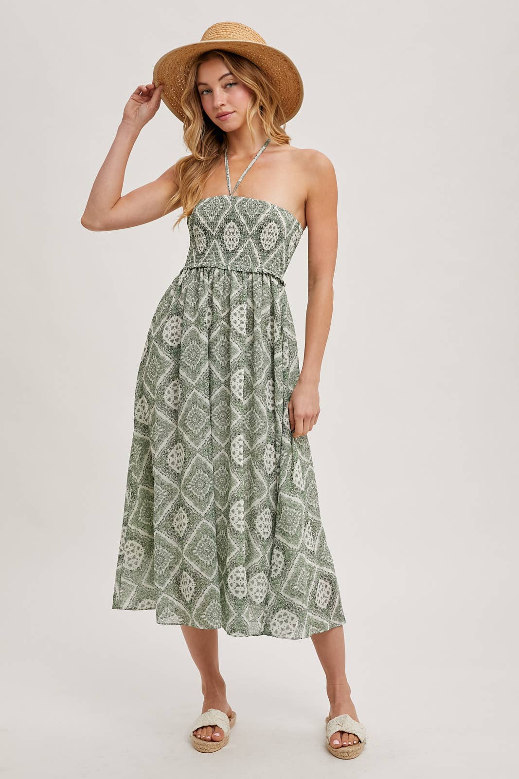The geo print smocked halter dress combines a bold pattern with a flattering silhouette for a chic and effortless look. Featuring a smocked bodice for a comfortable, fitted feel, this dress is complemented by a halter neckline that adds a touch of elegance. The flowing skirt ensures ease of movement, making it perfect for casual outings, beach days, or summer events. Its eye-catching geometric print adds a modern flair, making it a stylish choice for warm-weather dressing.