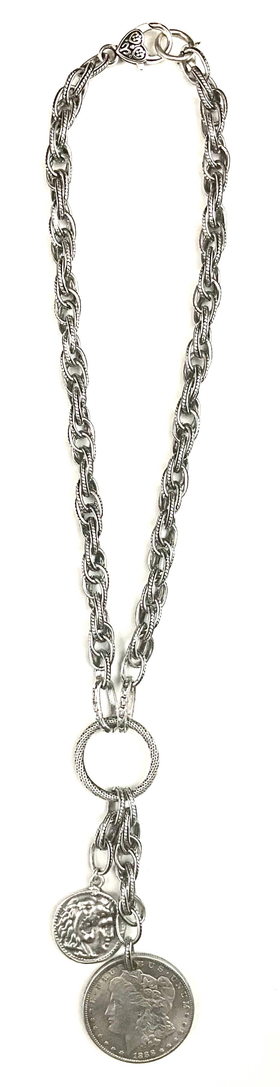 Necklace- Bold Interlink Chain with Ring and Dbl Coins Dangle
