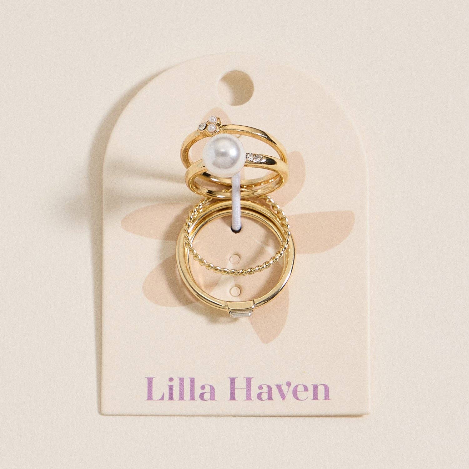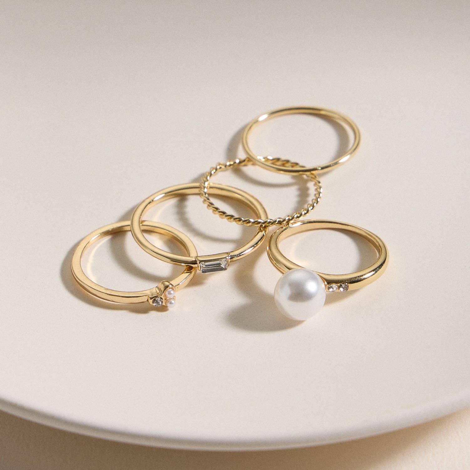 This elegant 5-piece gold ring set features a mix of textures and accents, including a statement faux pearl, delicate crystal details, and a twisted band. Designed for effortless stacking or standout solo wear, each ring brings a refined touch to any jewelry collection. Perfect for boutique owners looking to offer versatile and feminine accessories with a modern finish.