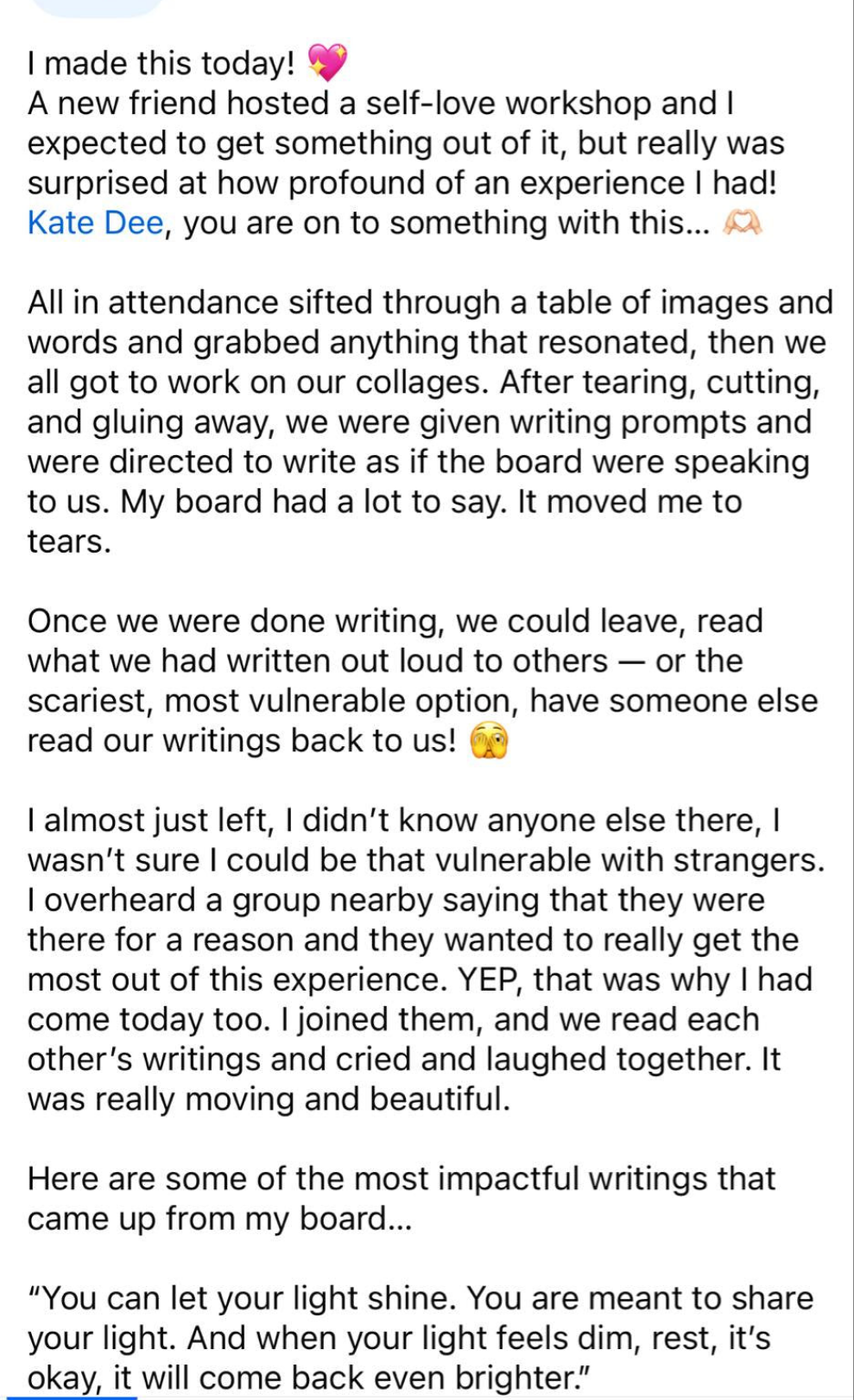 You will leave with a beautiful collage of the wisdom you effortlessly pull out of your own heart.