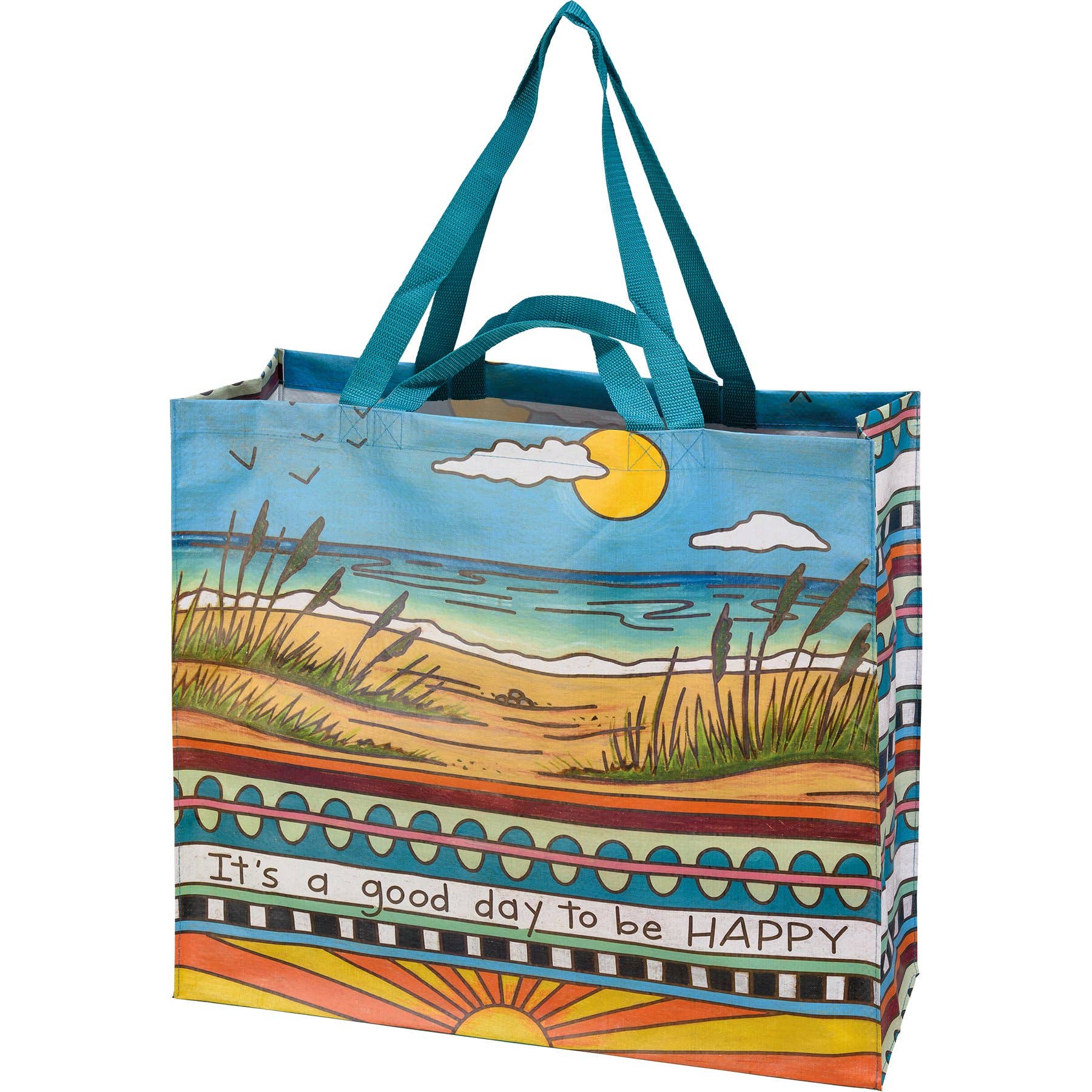 Made of post-consumer material, this double-sided shopping tote features colorful wood burned designs with "It's A Good Day To Be Happy" sentiment. Gussets feature coordinating design. Our It's A Good Day To Be Happy shopping tote contains an interior pocket and dual nylon hand and shoulder straps for easy carrying.