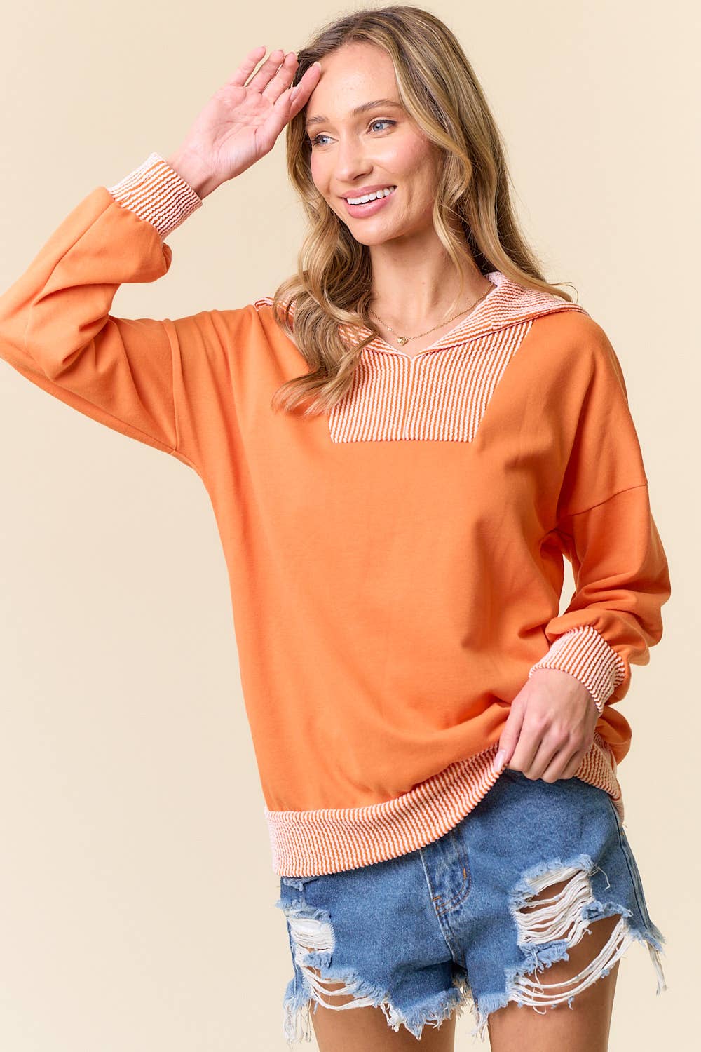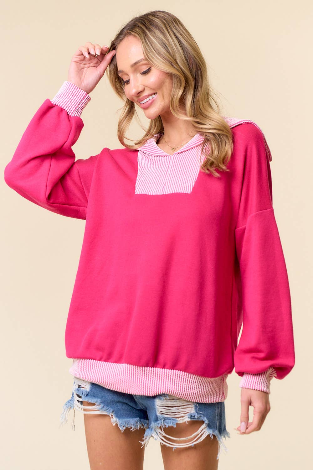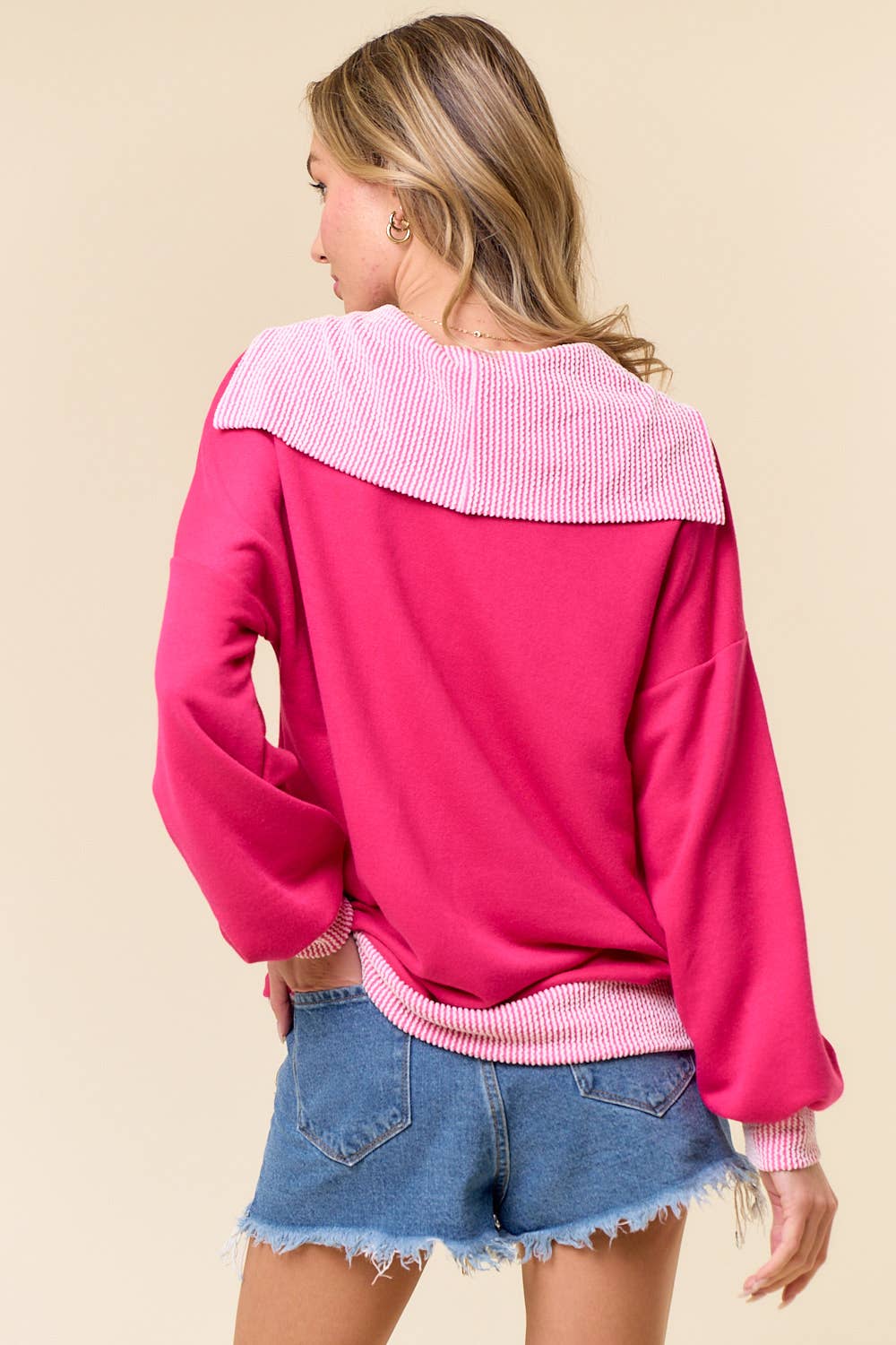 Our "Love Letter" sweatshirt is made of a soft polyester material. Colorful solid and two toned ribbed contrast. Has big collar detail. Relaxed fit.