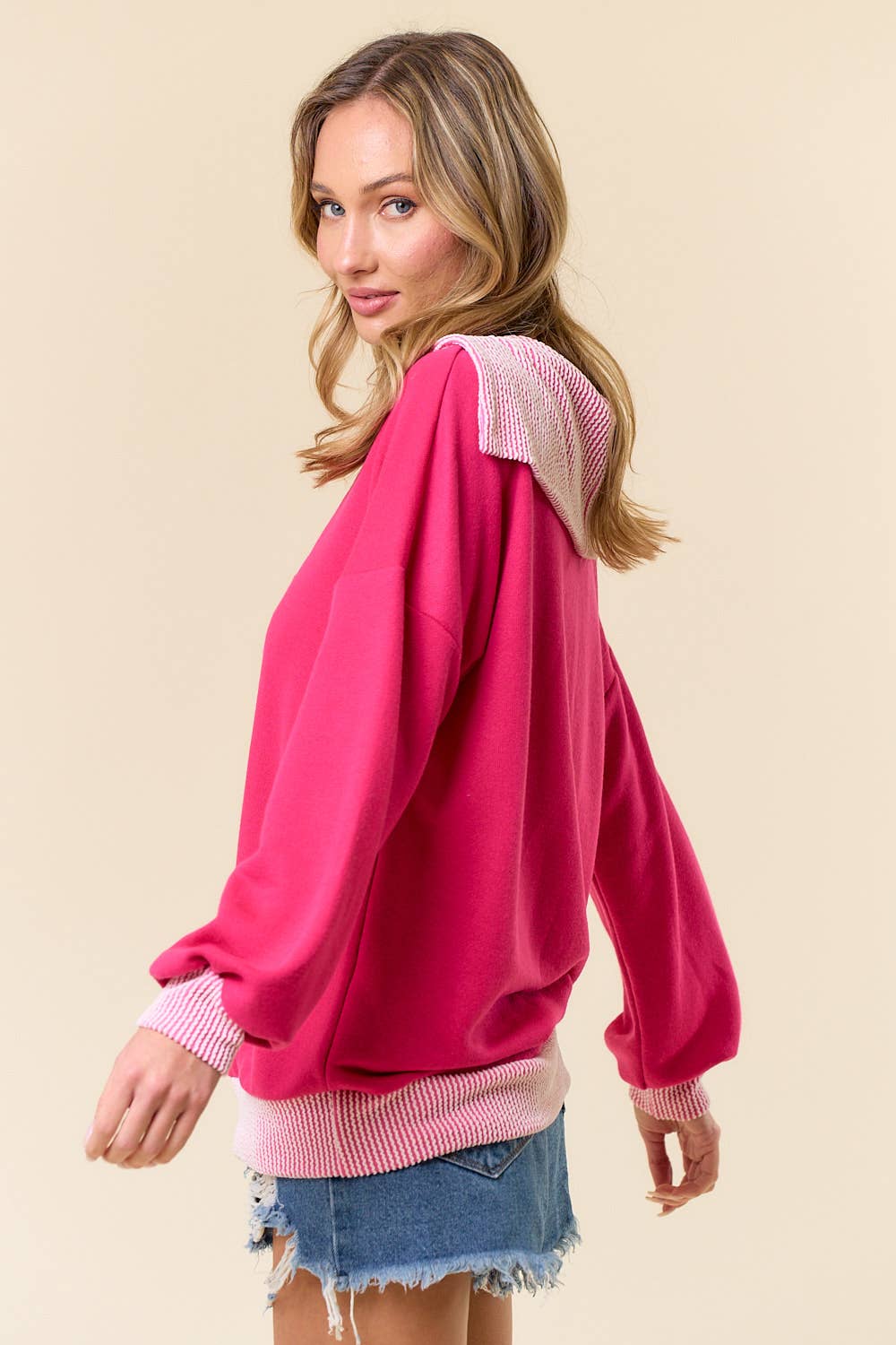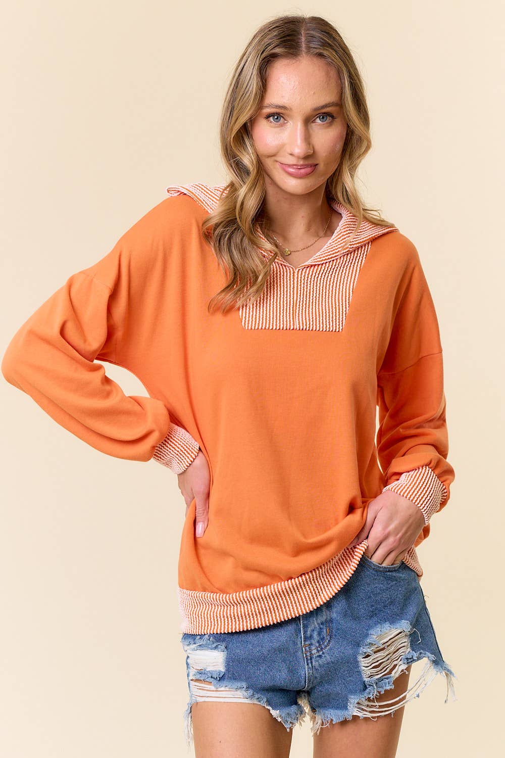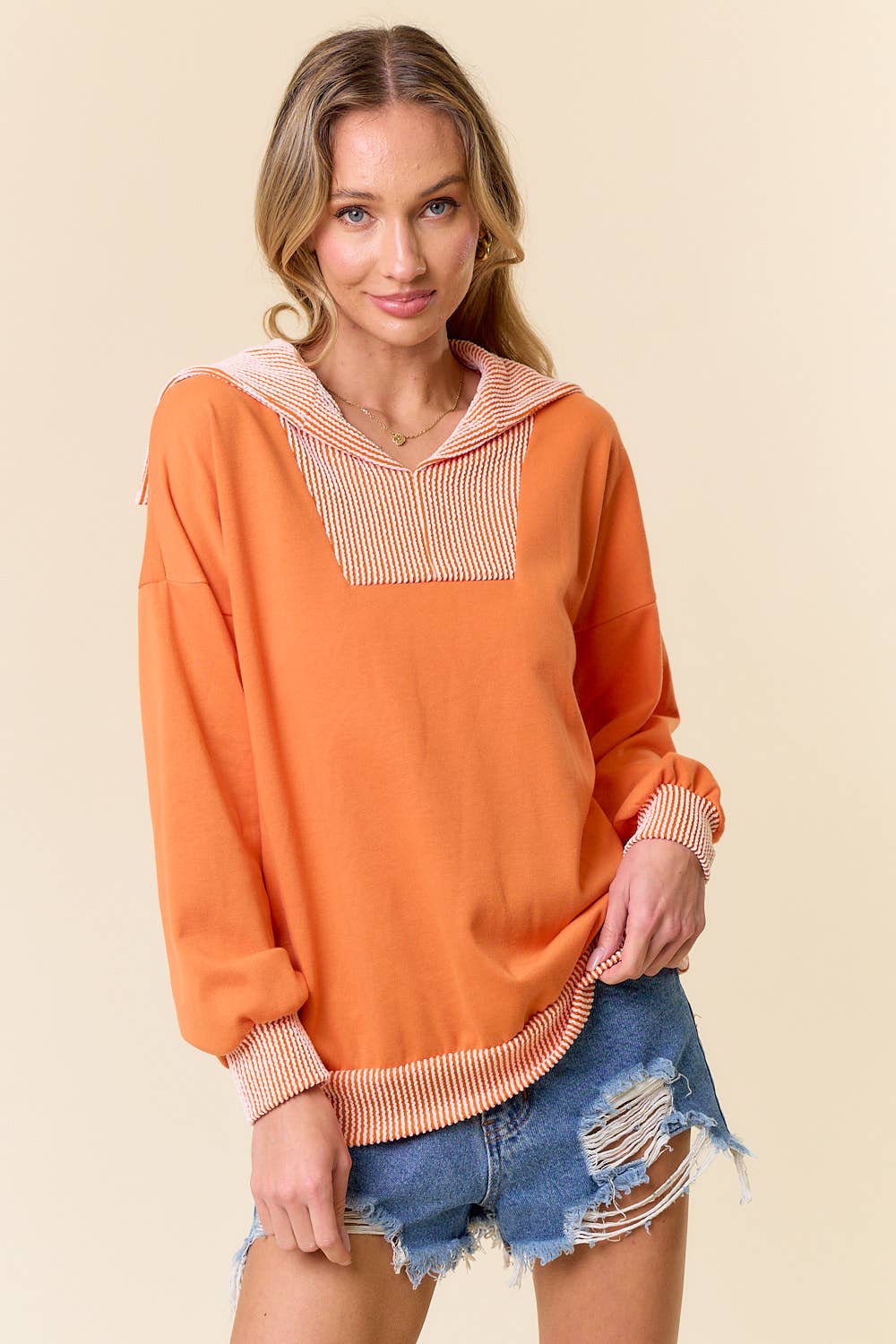 Our "Love Letter" sweatshirt is made of a soft polyester material. Colorful solid and two toned ribbed contrast. Has big collar detail. Relaxed fit.