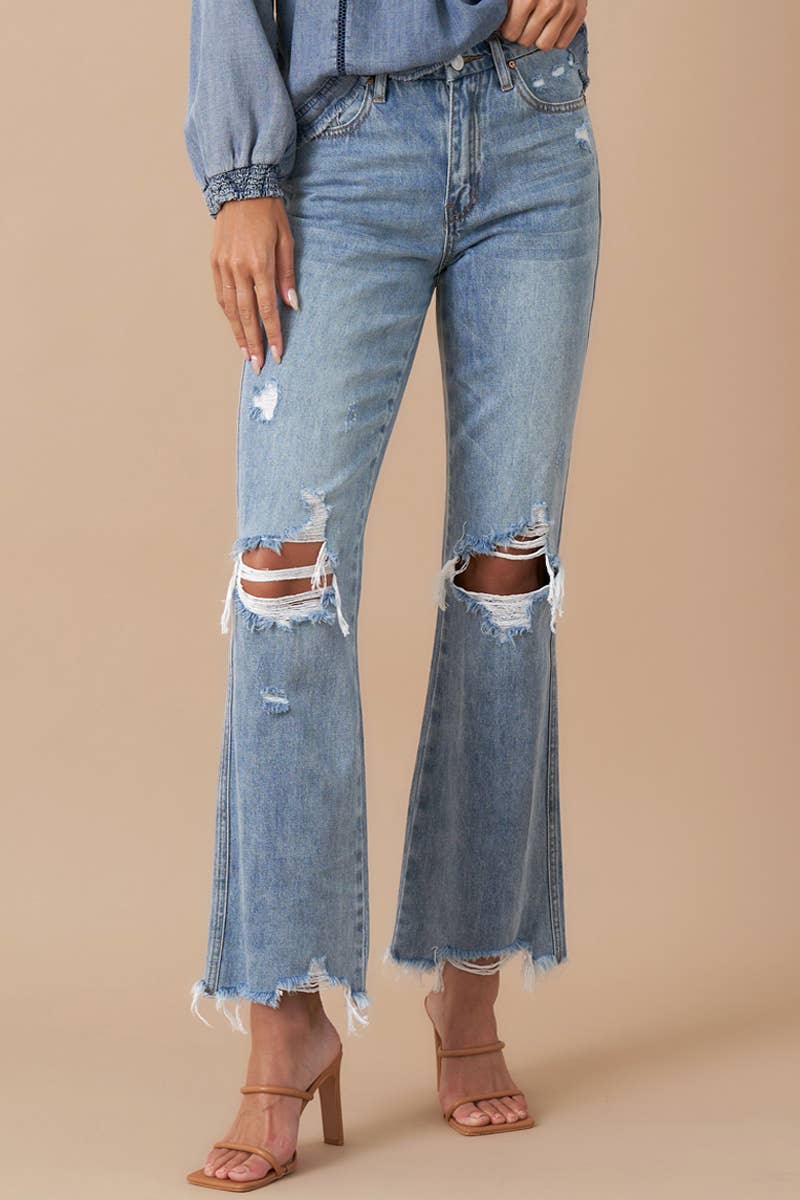 Details: Mid Rise, Flare Jeans, Distressed Bottom Hem
