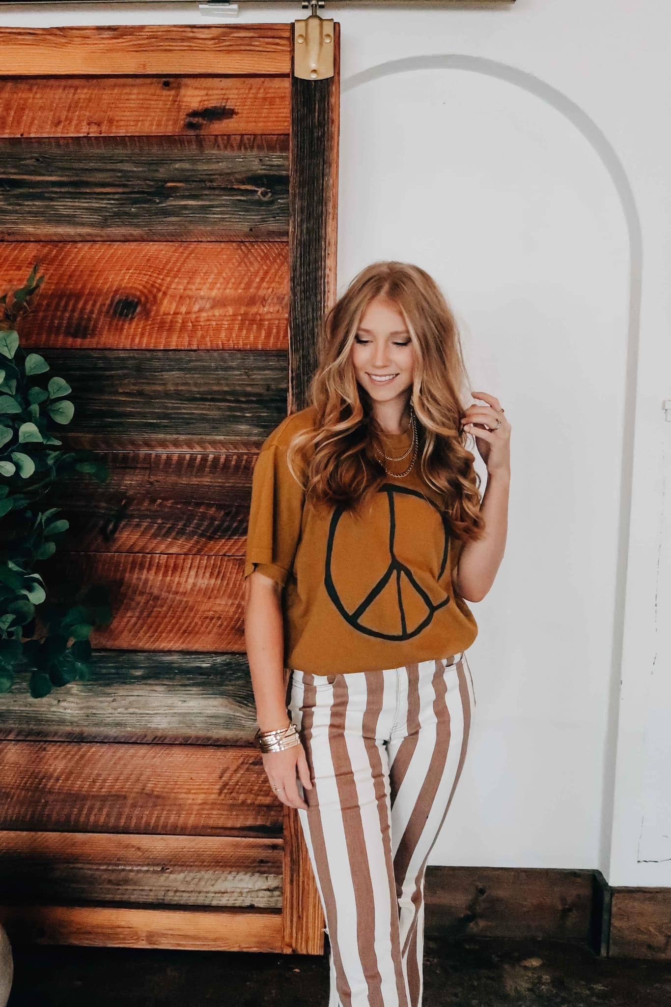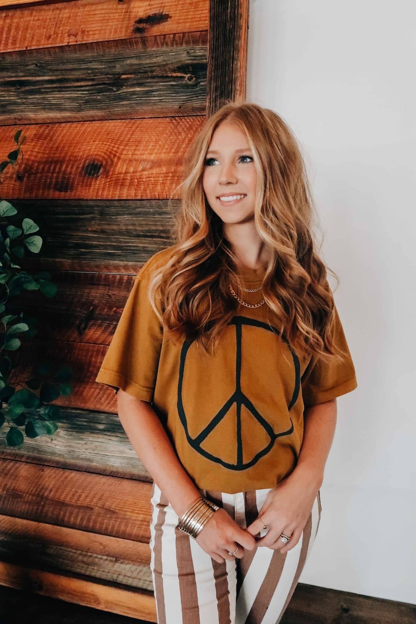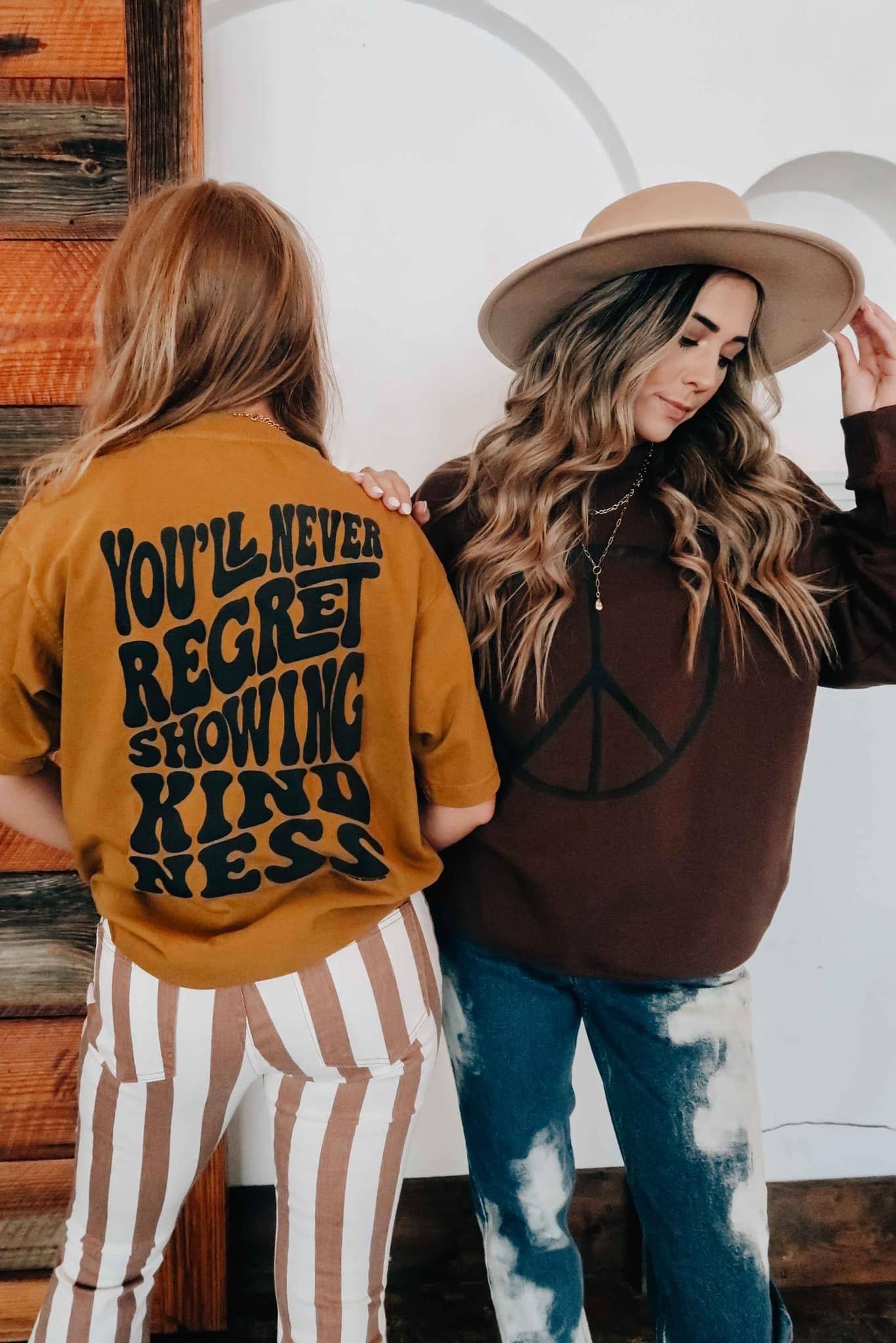 Peace Sign front print - You'll Never Regret Showing Kindness printed on back in black puff.
