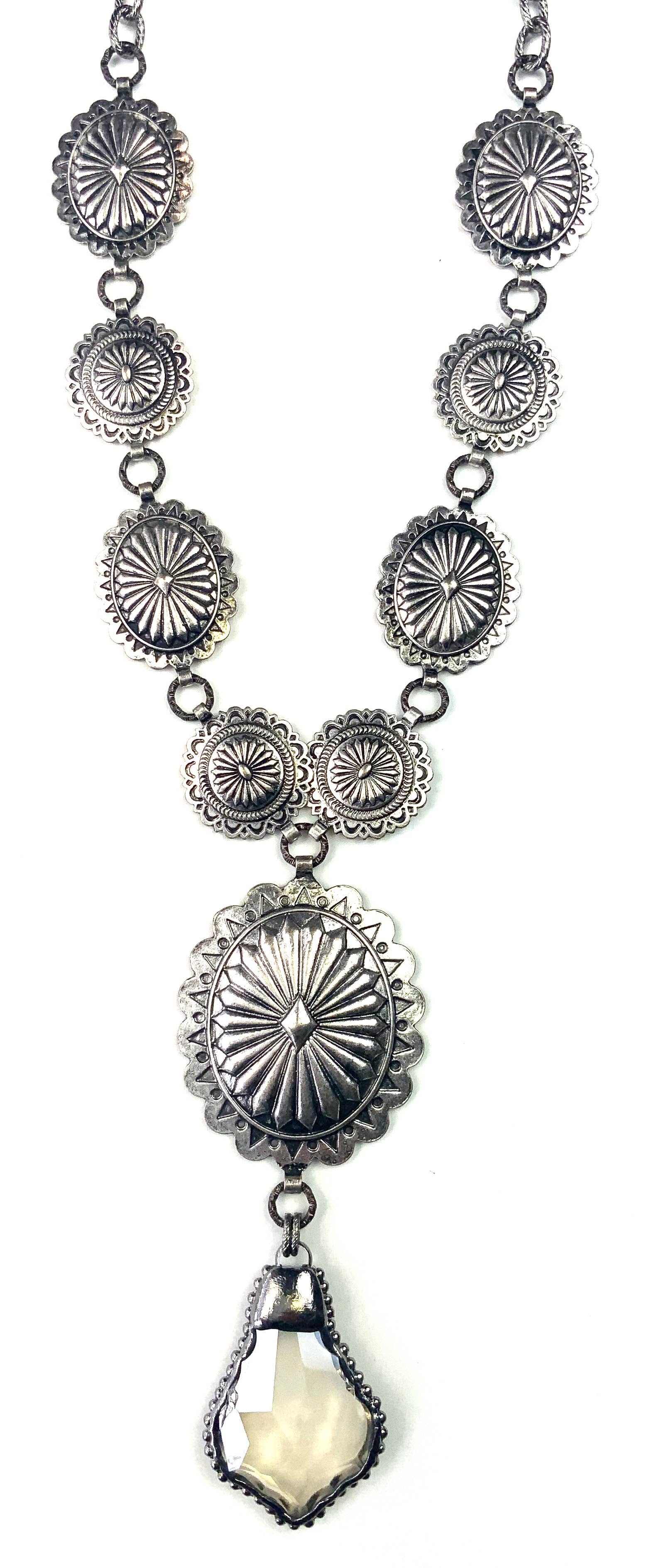 Necklace- Mixed Linked Conchos with Edged Glass Pendant