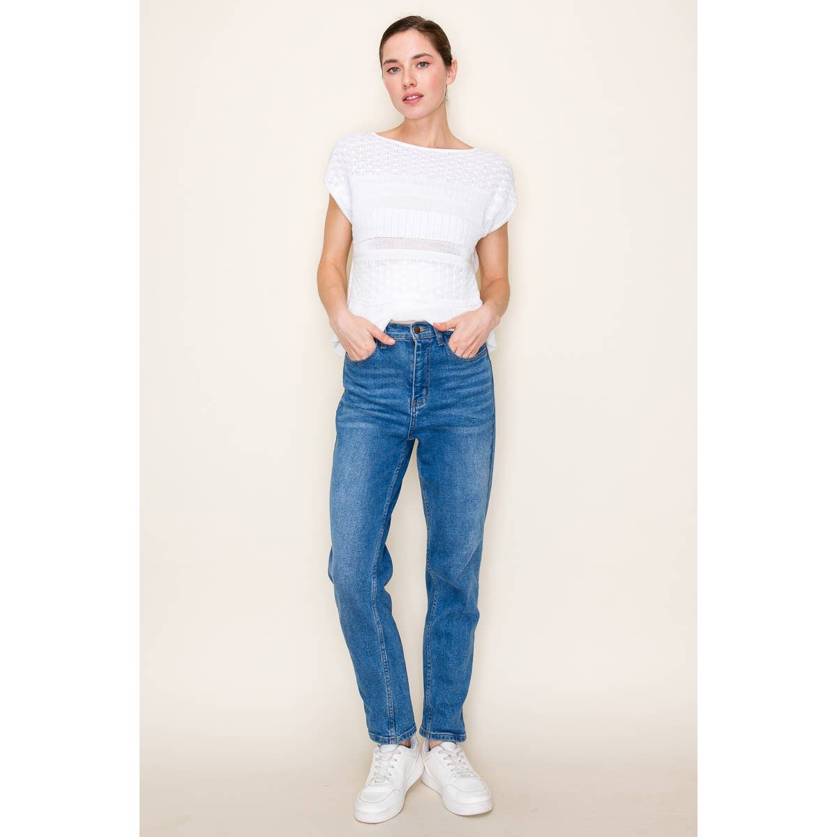 CROCHET KNITTED, SHORT SLEEVE, WIDE CREW NECK, PULLOVER SWEATER