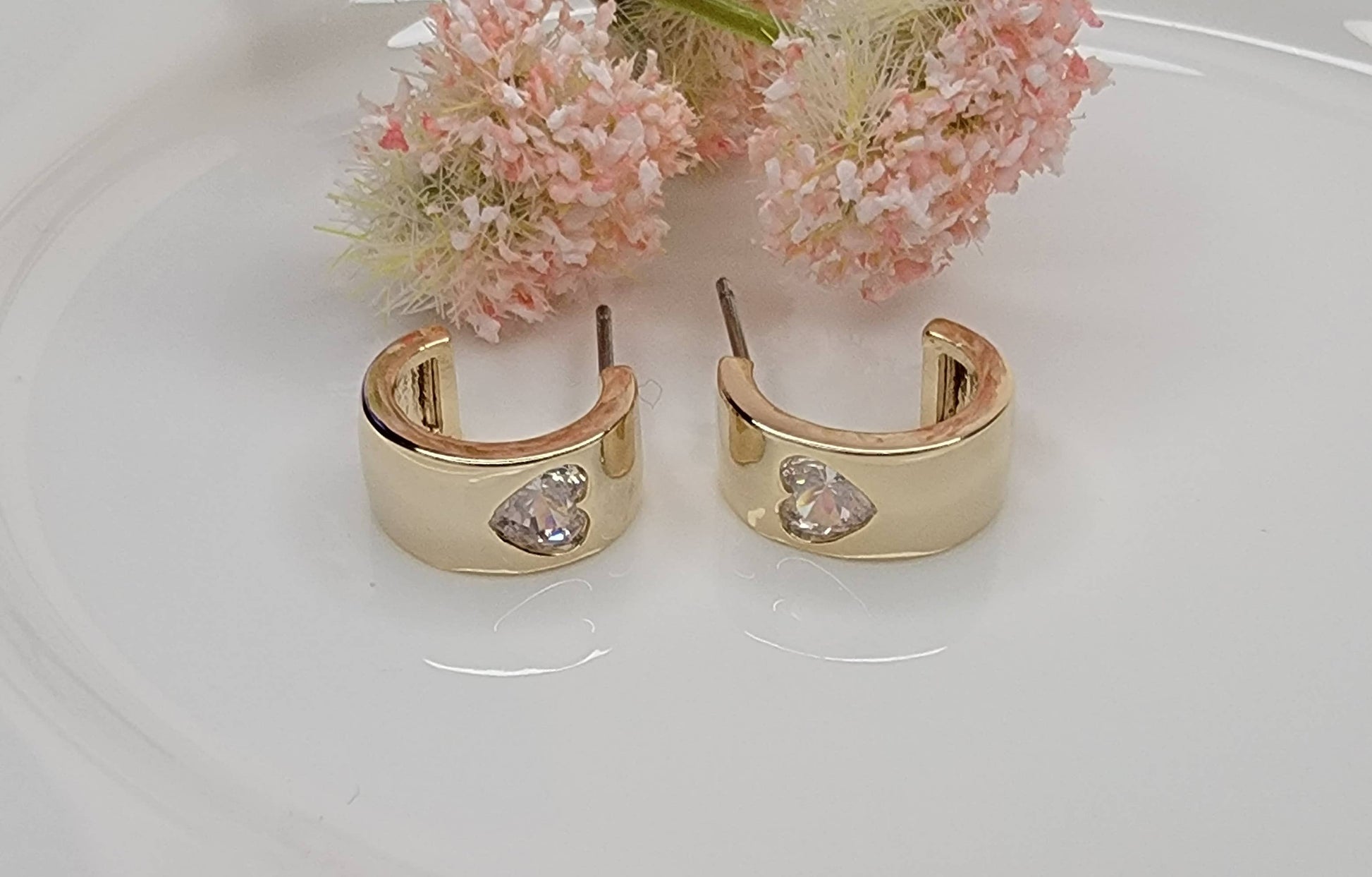 SINGLE HEART CZ DECO HOOP EARRINGS.