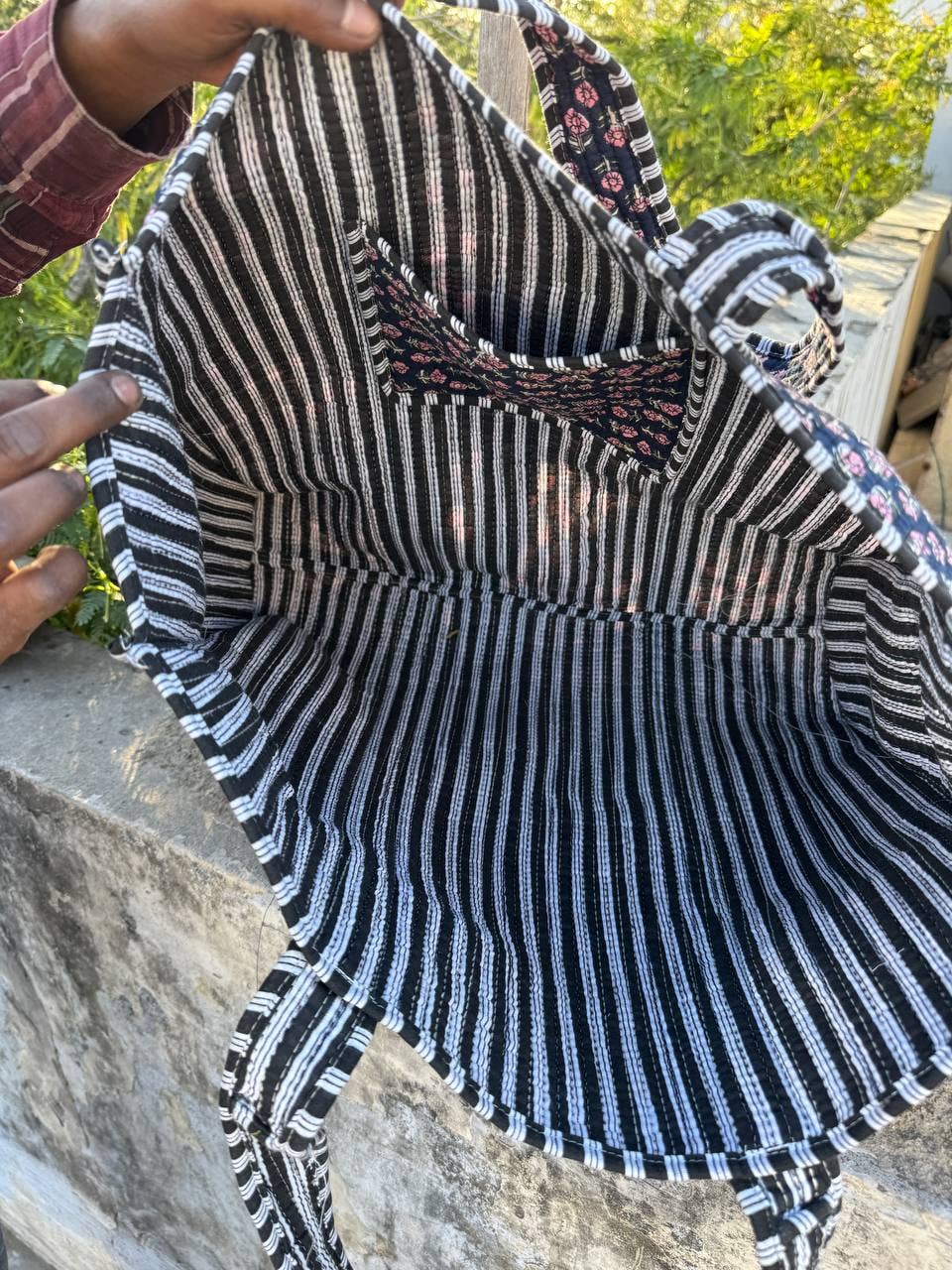 Cotton quilted travel bag made by Indian Artisans, This cotton quilted shopping bag is totally unique and multi purpose. Use this for your grocery or as a travel bag. Perfect to suit everyone.