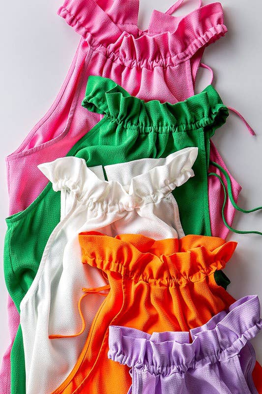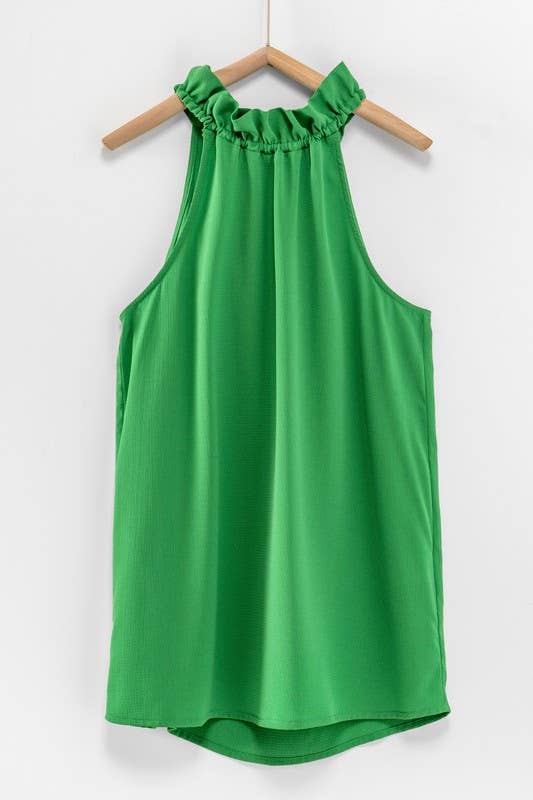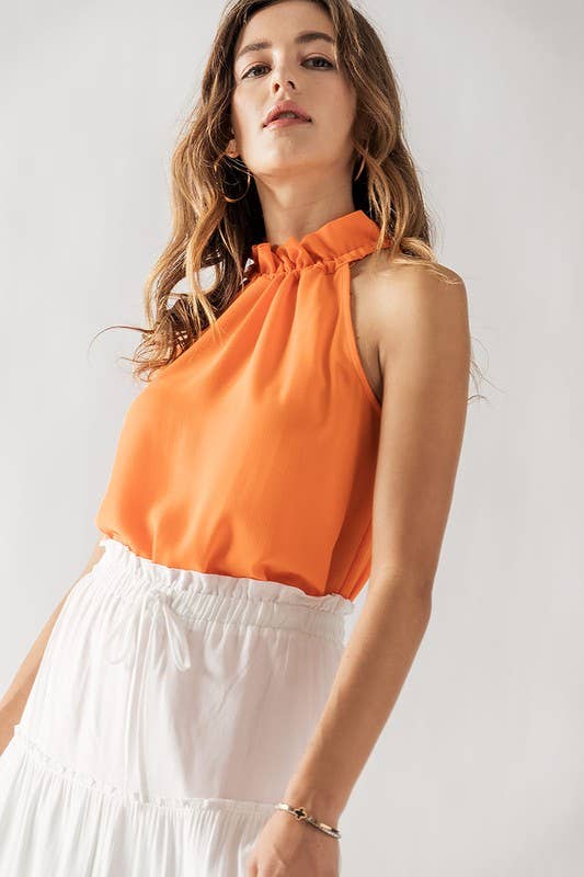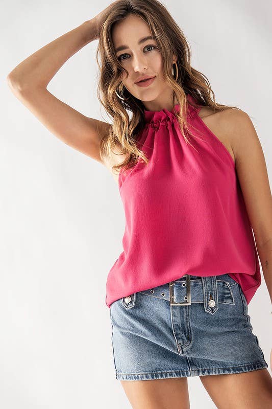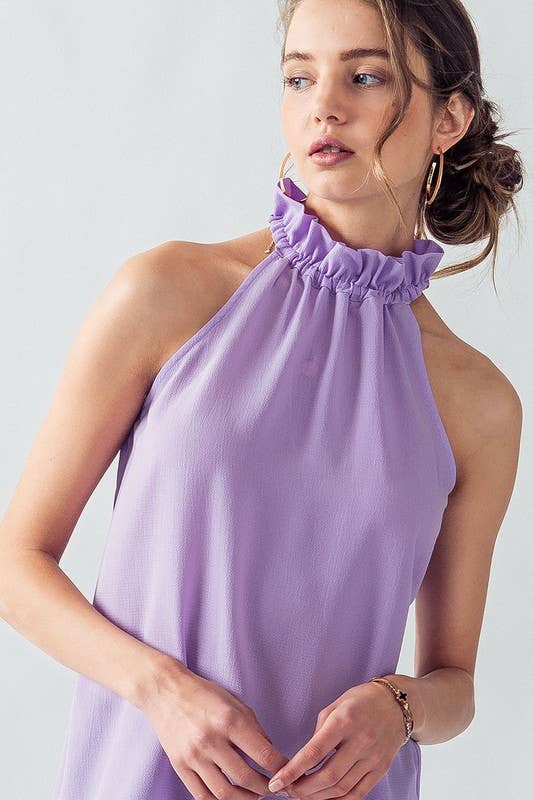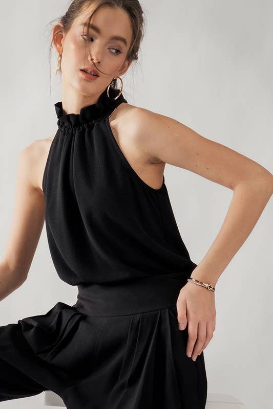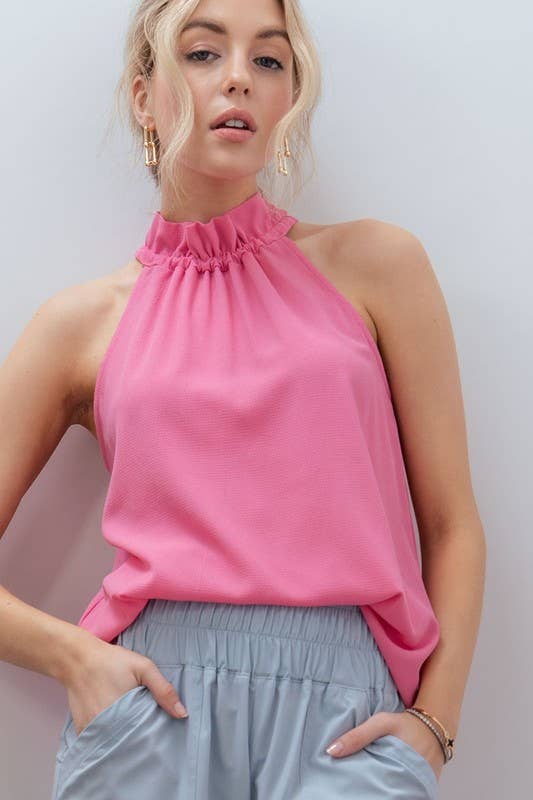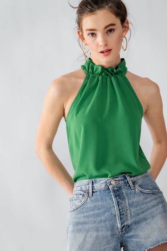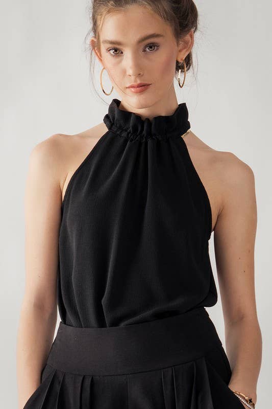 SOLID RUFFLE MOCK NECK OPEN BACK TIE HALTER TOP