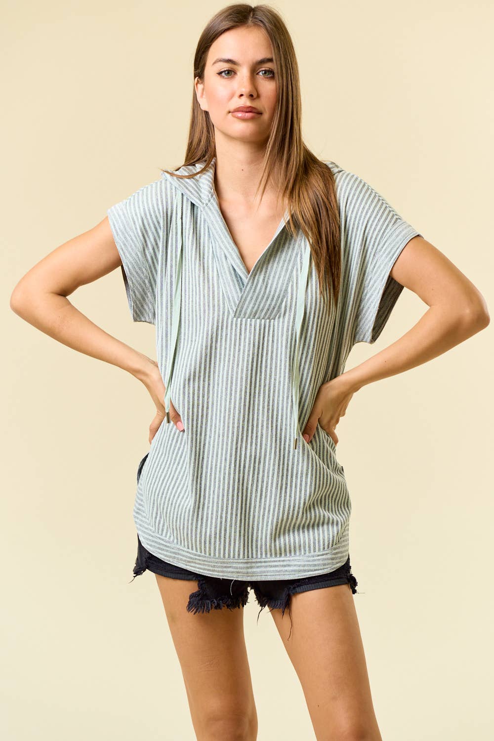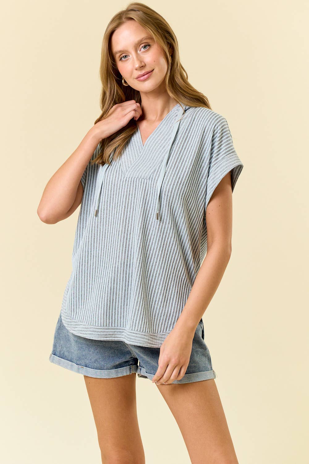 Stripe Textured Knit V-Neckline Dolman Short Sleeve Hooded Round Hem Sweatshirt
