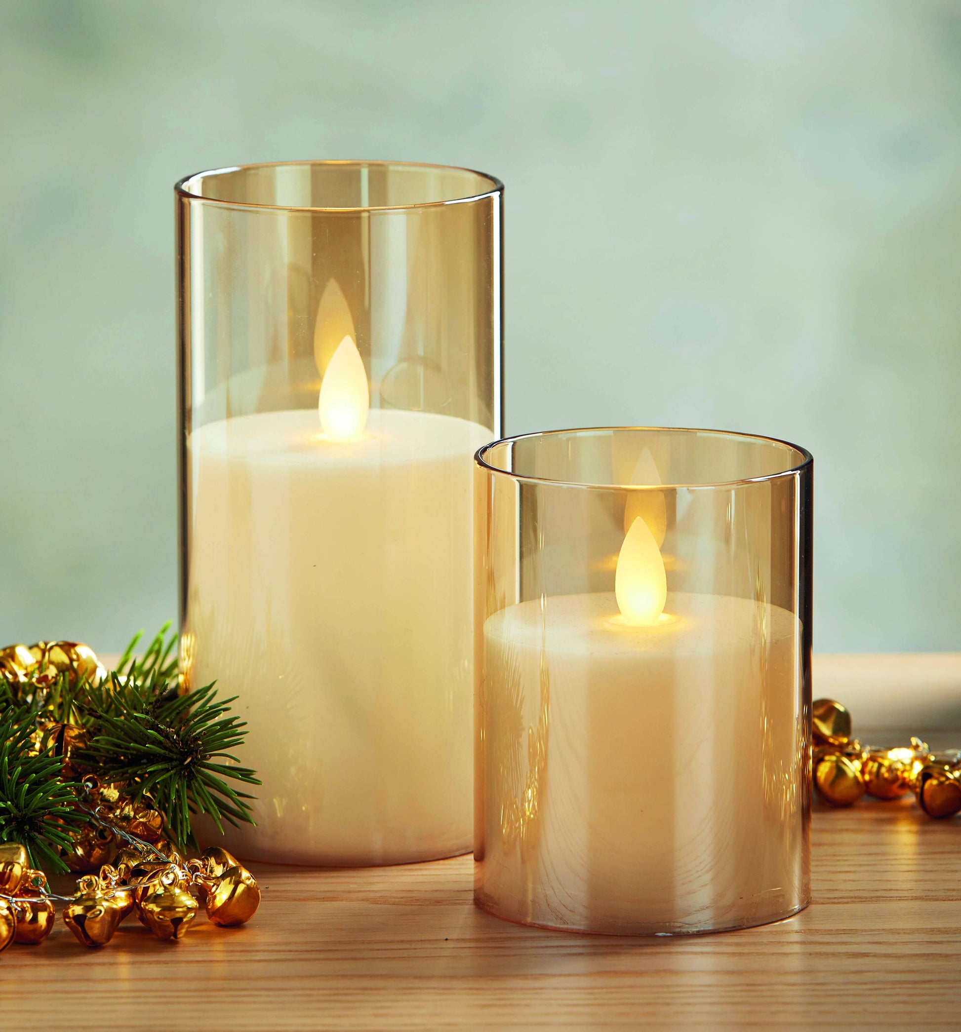 add a touch of sophistication and elegance to your home decor with this estella amber glass hurricane led pillar candle. the candle features a realistic-looking flame that flickers like a real candle. it is made from high-quality wax and plastic, and the amber glass hurricane provides a sophisticated look.