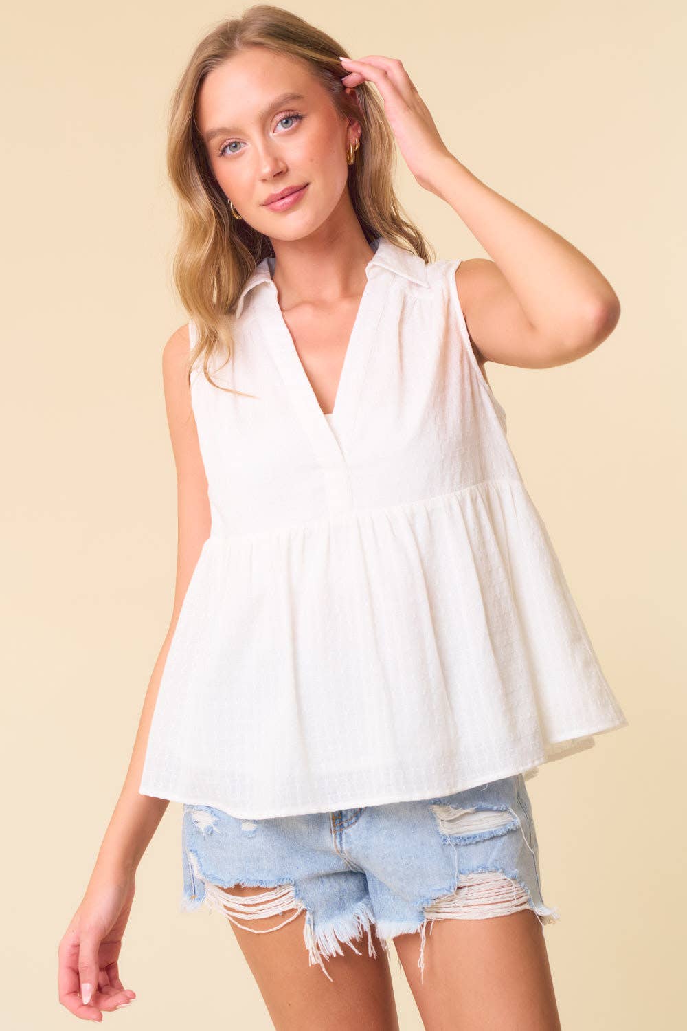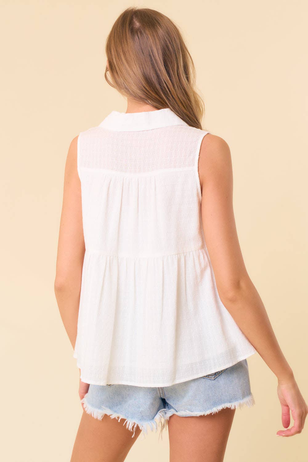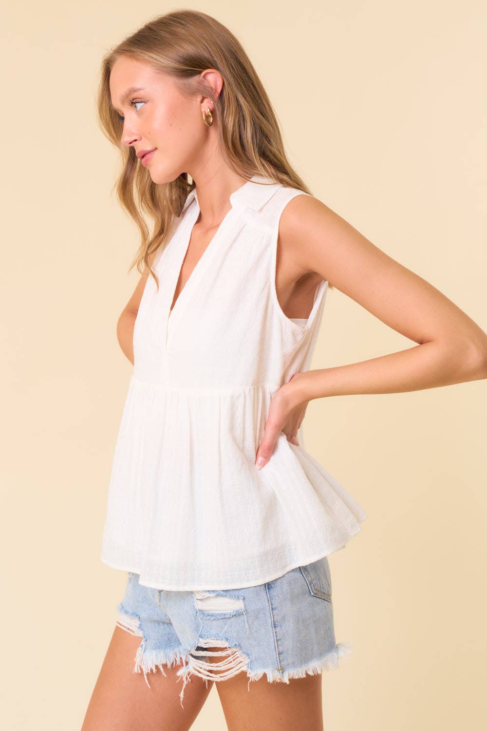 Textured Cotton Collared Split V-Neck Sleeveless Top
