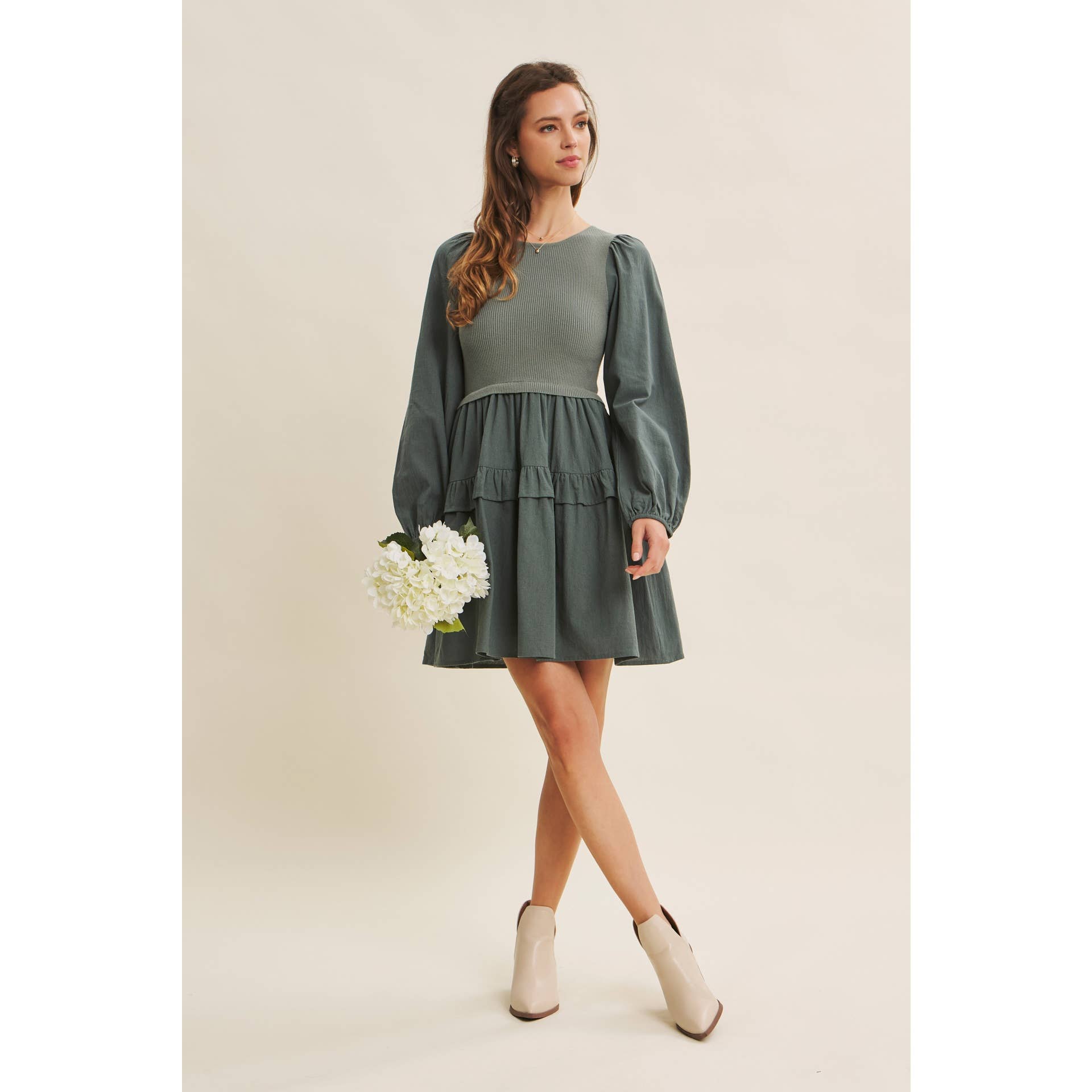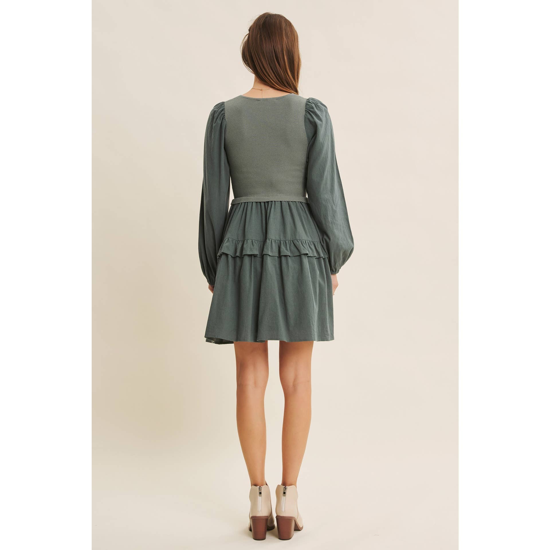 A fresh take on cozy romance — this twofer mini dress blends the comfort of soft sweater knit with the crisp charm of cotton. The viscose-blend knit bodice hugs just right, while the woven skirt and long balloon sleeves bring structure and airiness to the silhouette.