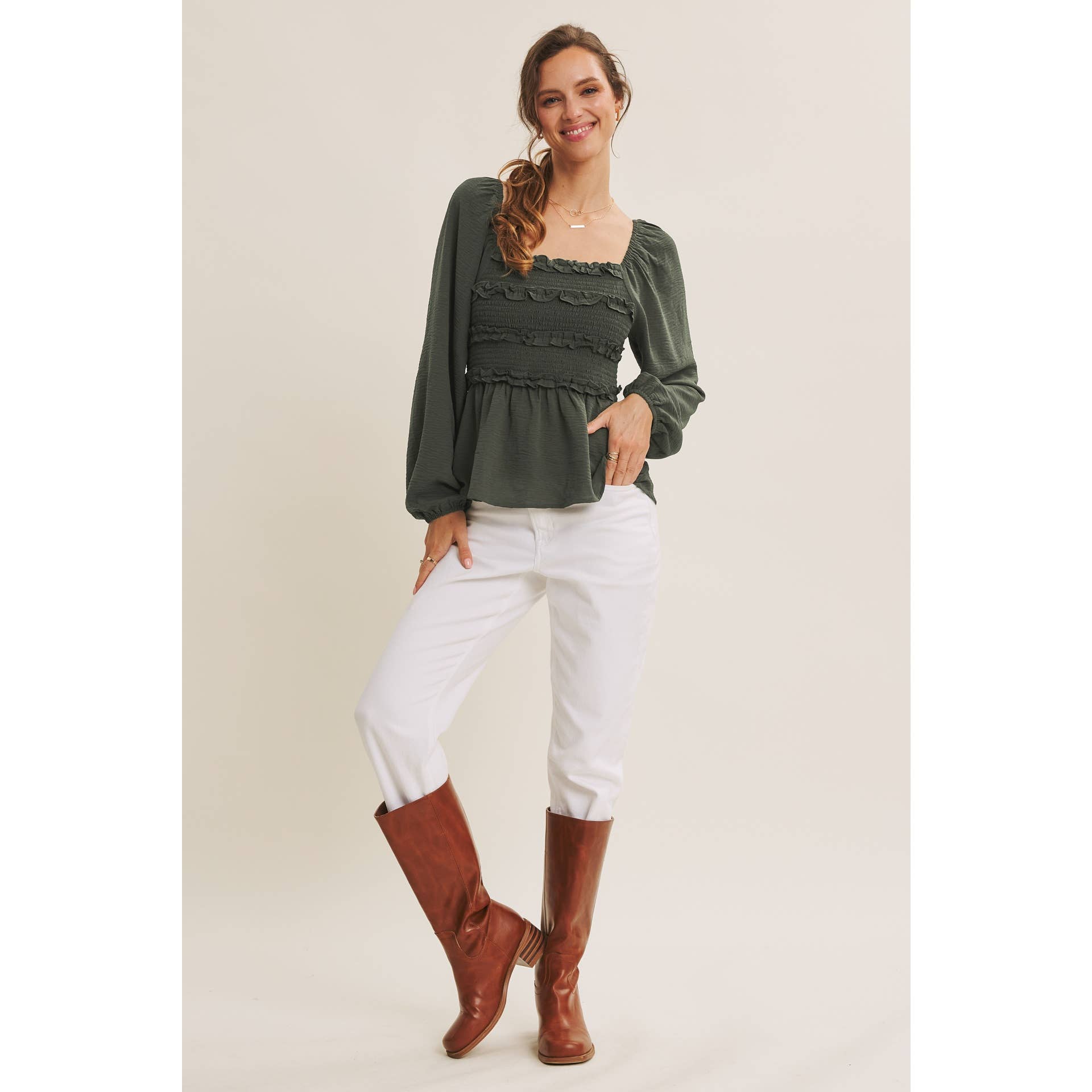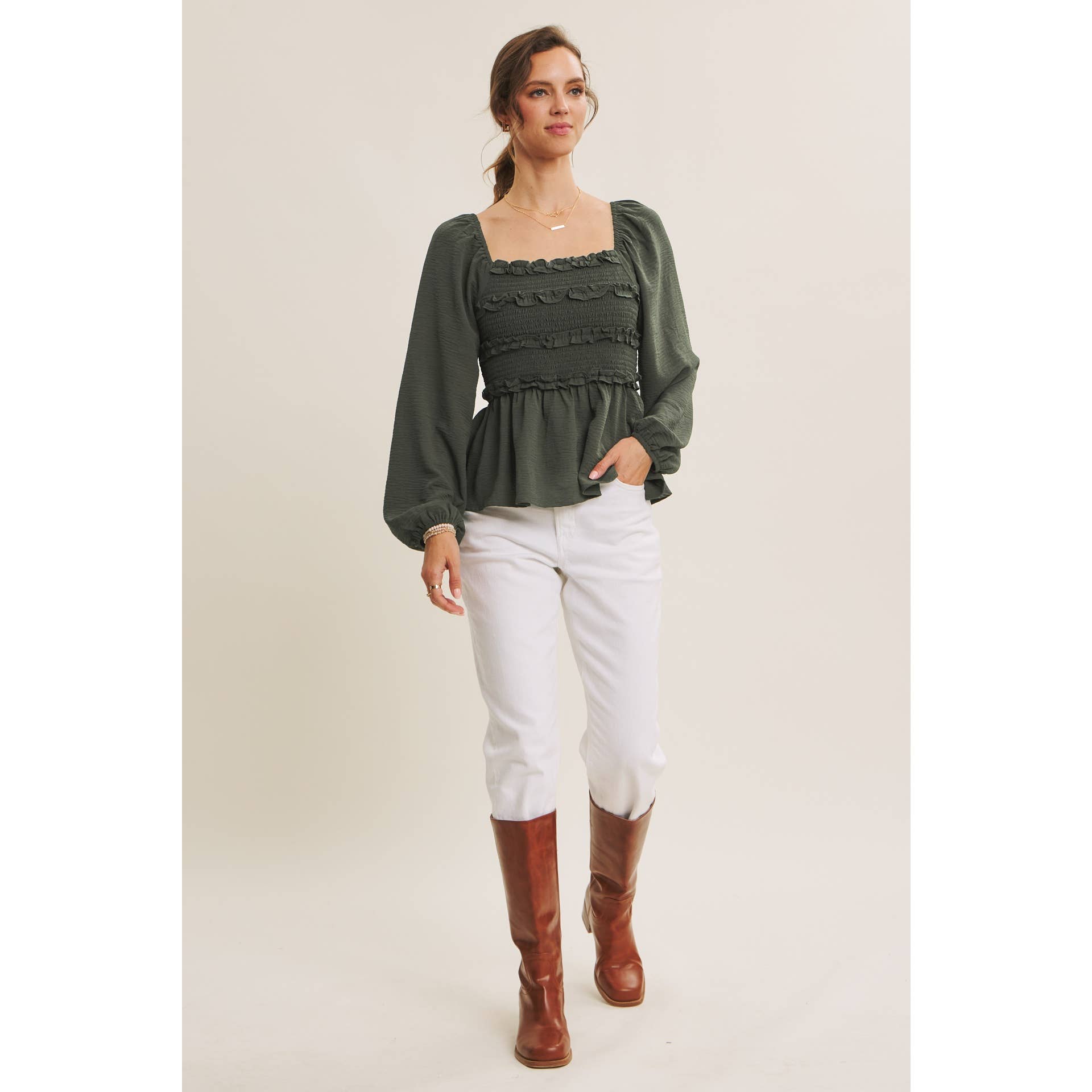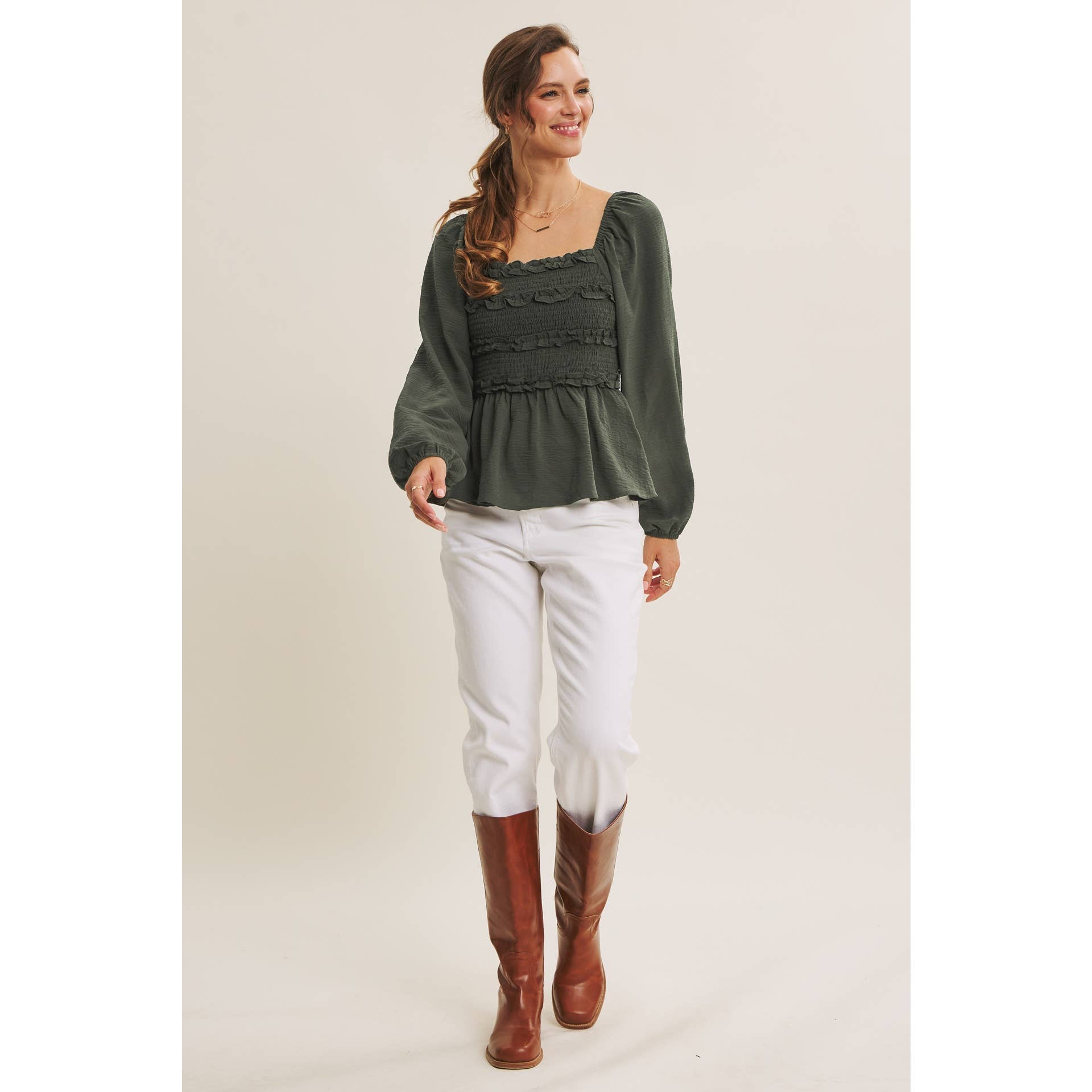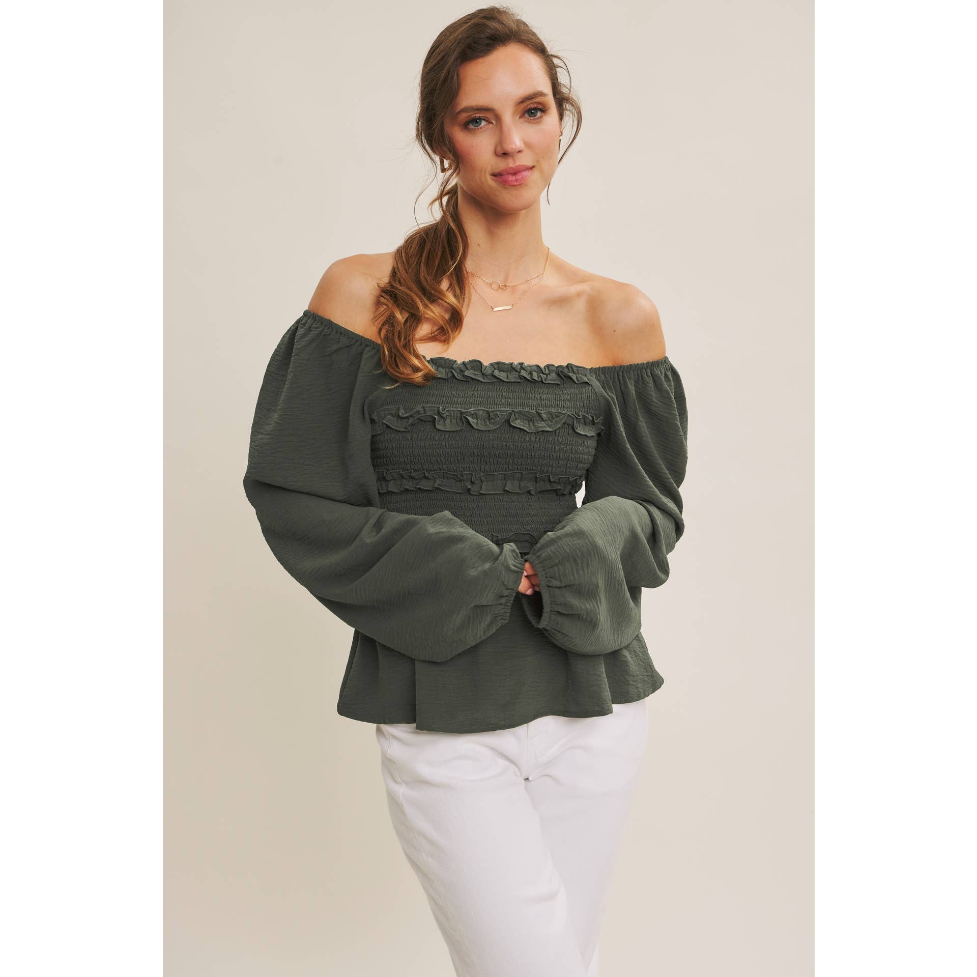 Your new wear-anywhere blouse. Equally perfect for workdays and weekend adventures. This convertible design lets you wear it two ways: as a sophisticated off the shoulder or styled as a square neck for a relaxed, romantic look. Crafted in soft crinkled woven fabric, it features a smocked bodice for a flattering fit and a babydoll peplum for an easy, feminine silhouette. Mini ruffles across the bust add subtle detail, while long balloon sleeves bring graceful movement. Whether paired with tailored pants for the office or denim for brunch, this versatile top delivers endless styling options with Free People-inspired ease.
